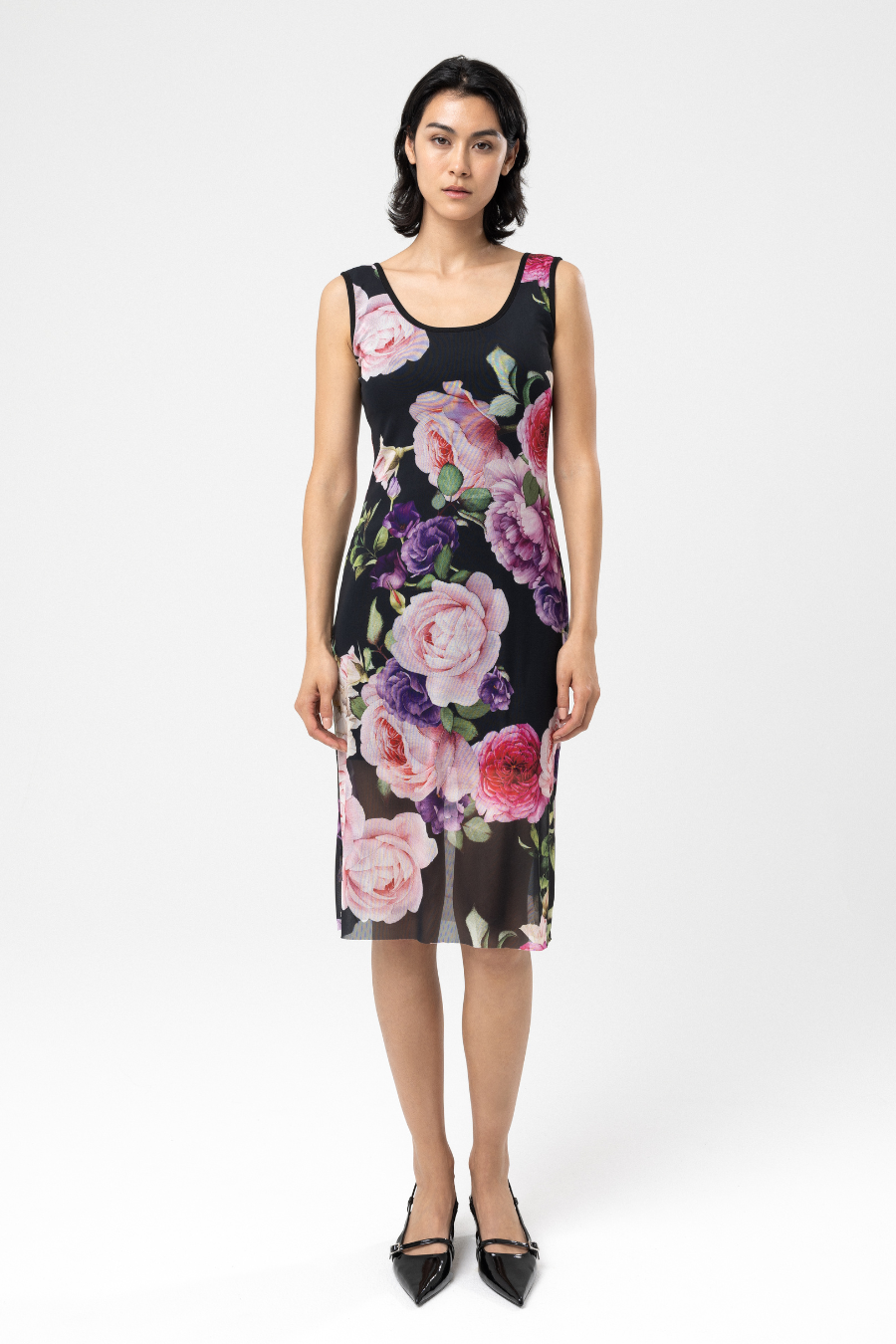 AMORE embodies the essence of passion, inspired by the delicate floral motifs of the Romantic era. Crafted from sheer black mesh, this captivating dress features a striking print of crimson, burgundy, and soft rose blossoms, reminiscent of classic paintings that evoke love and mystery. The sleeveless design and fitted silhouette gracefully accentuate the figure, while the knee-length hem enhances its timeless elegance. AMORE is a celebration of femininity, blending classic romance with modern refinement.