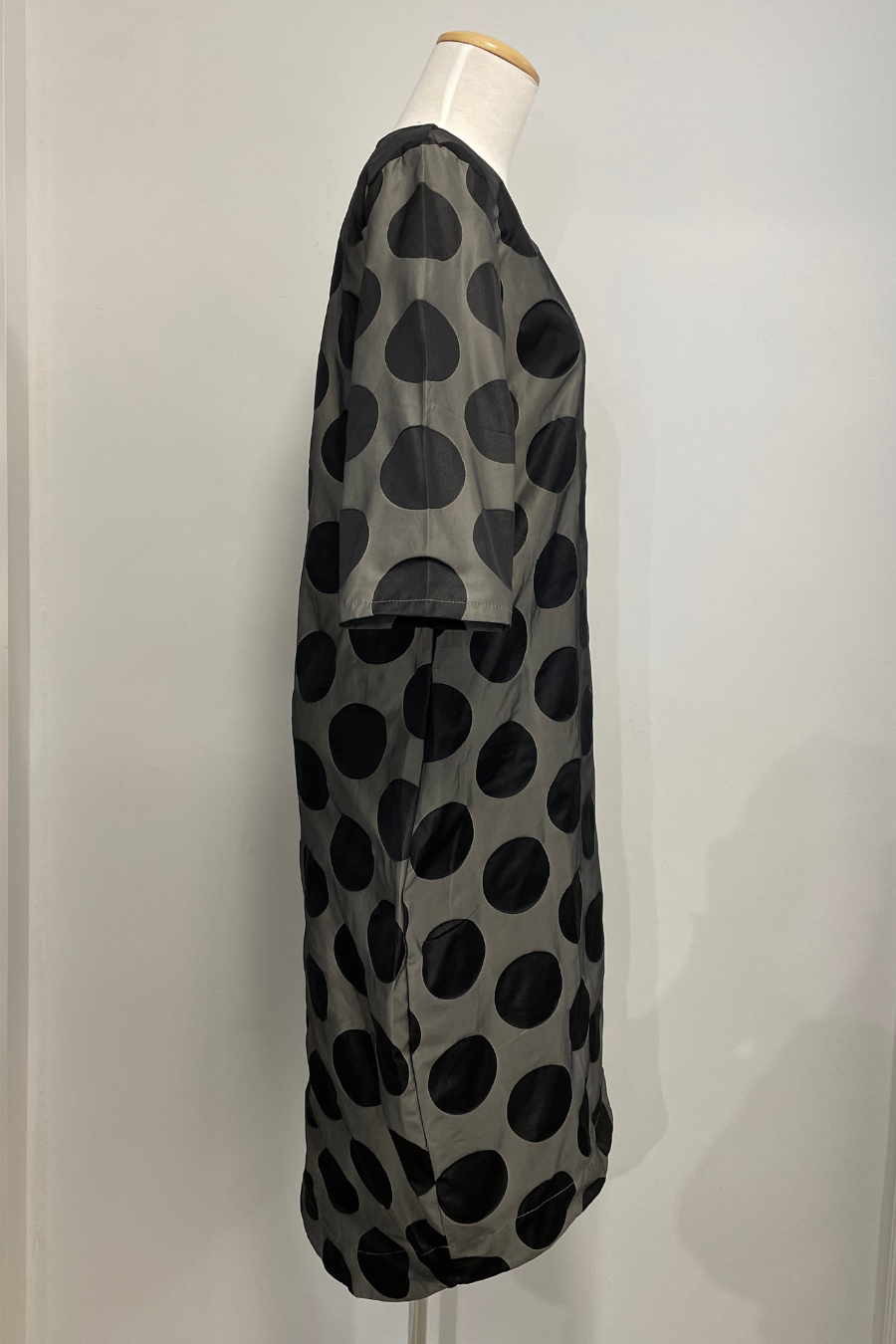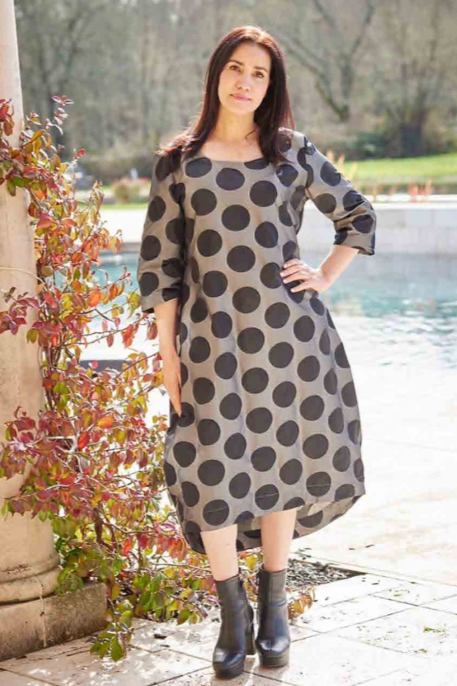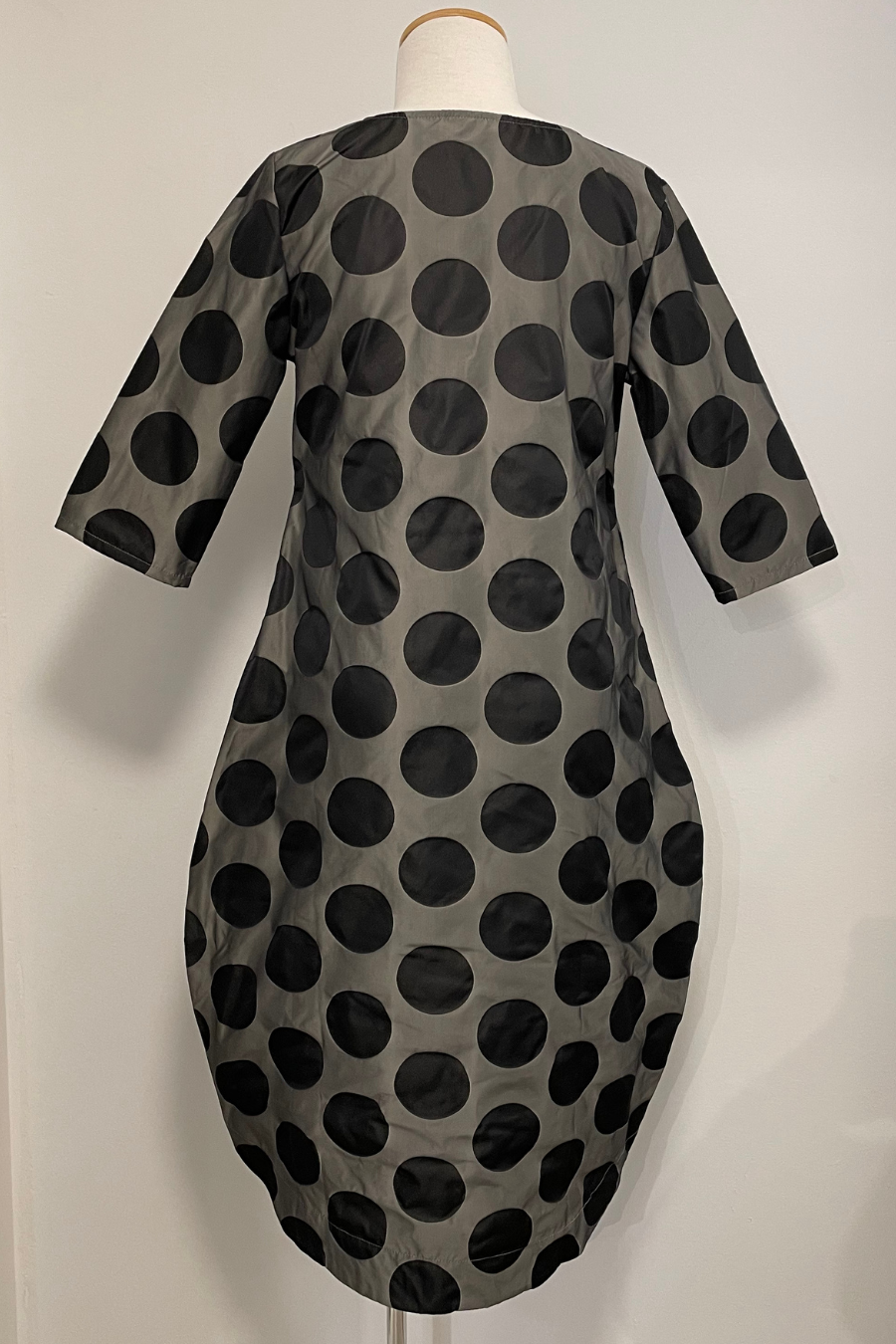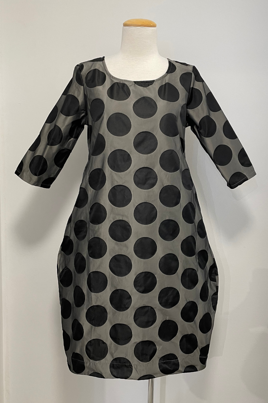 The bubble dress features a subtle rounded neckline, curved silhouette longer in the back with slightly curved hemline, 3/4 sleeves and side pockets.