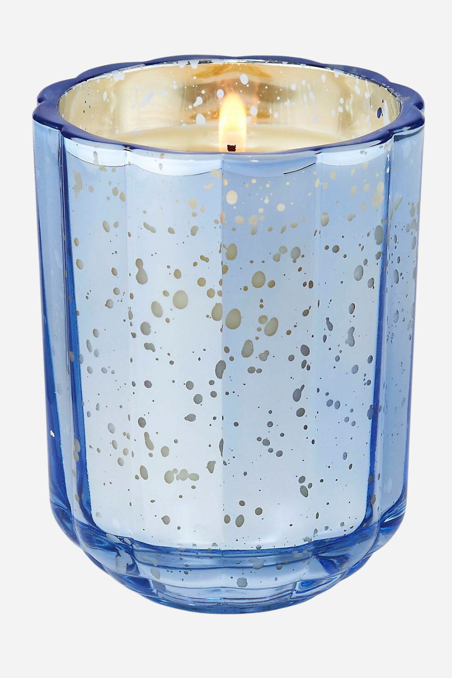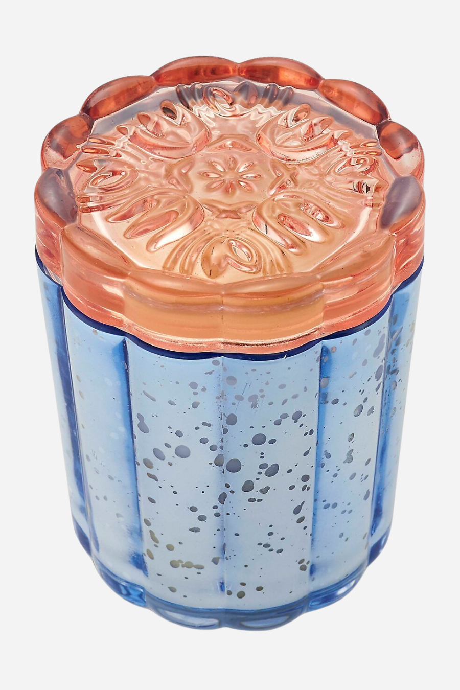 A speckled mercury glass vessel with a pressed glass, floral-shaped lid.the candle The fragrance combines scents of citrus, summer fruit and sandalwood. Its vessel is made in China and wax poured in the USA.