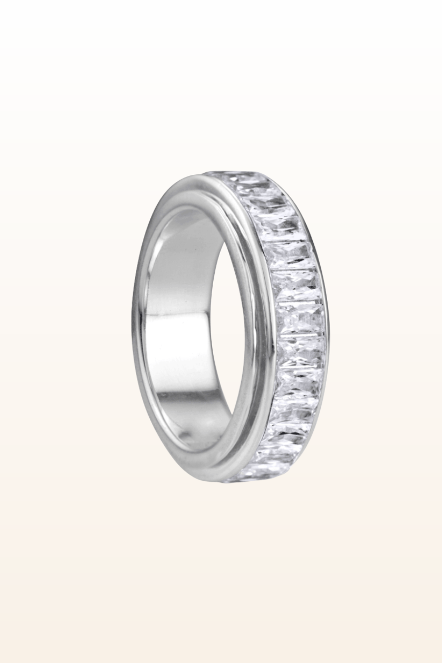 Gorgeous Sterling Silver Meditation Ring featuring stunning channel set clear CZ baguette spinning band.
