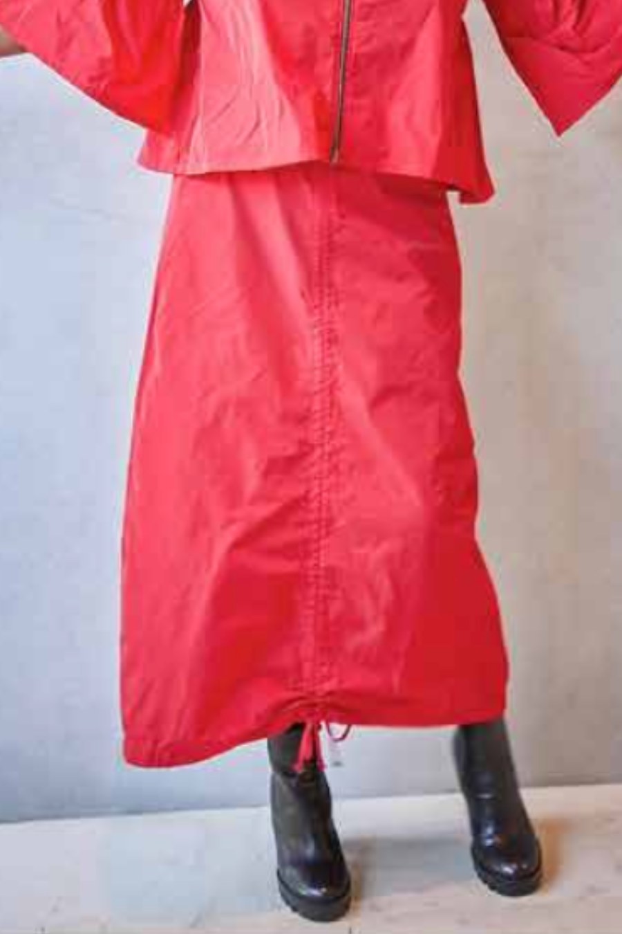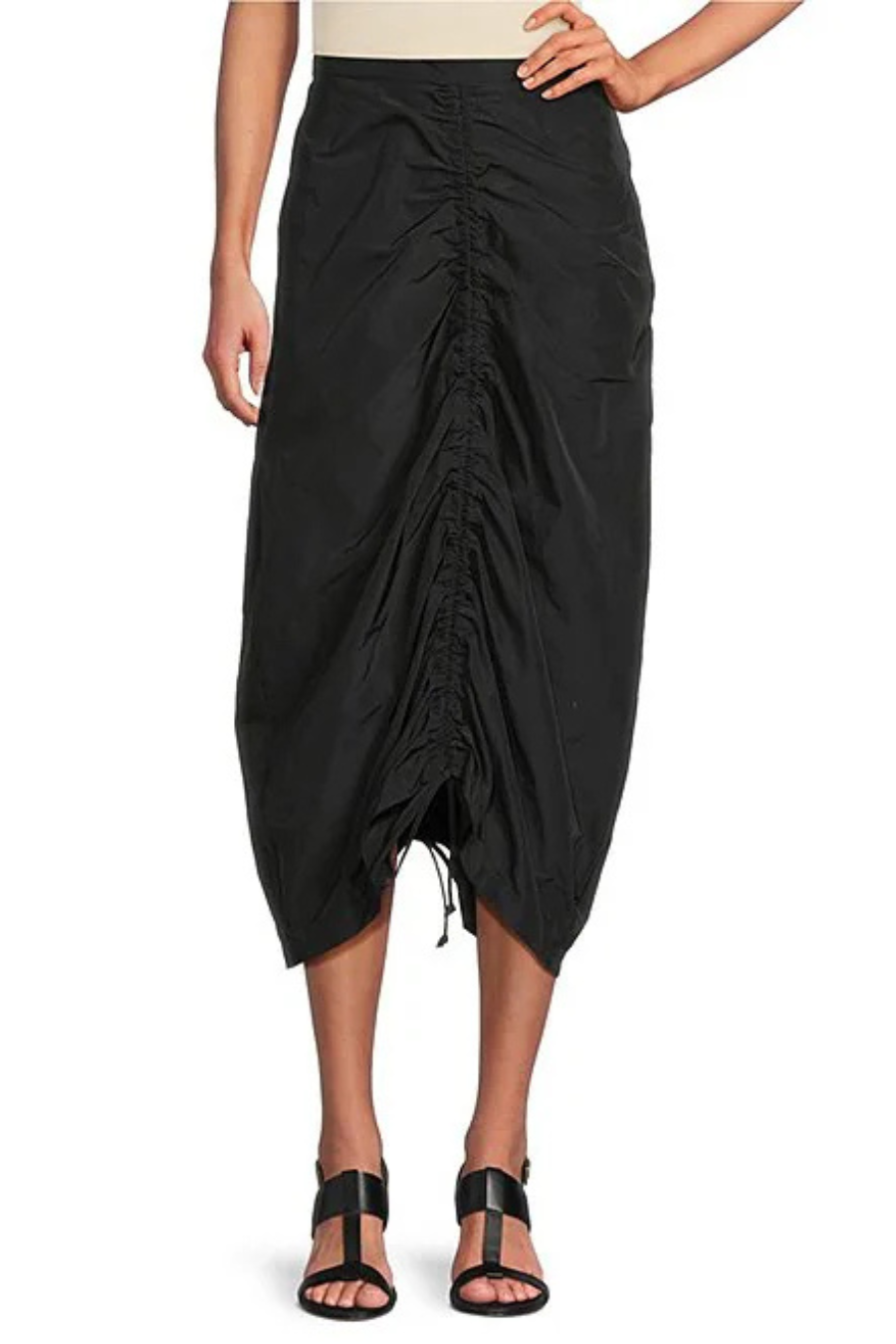 The Cleo skirt features a flat front with elastic back, front and back adjustable ties ruche detail a pull-on construction, approx. 36" length.