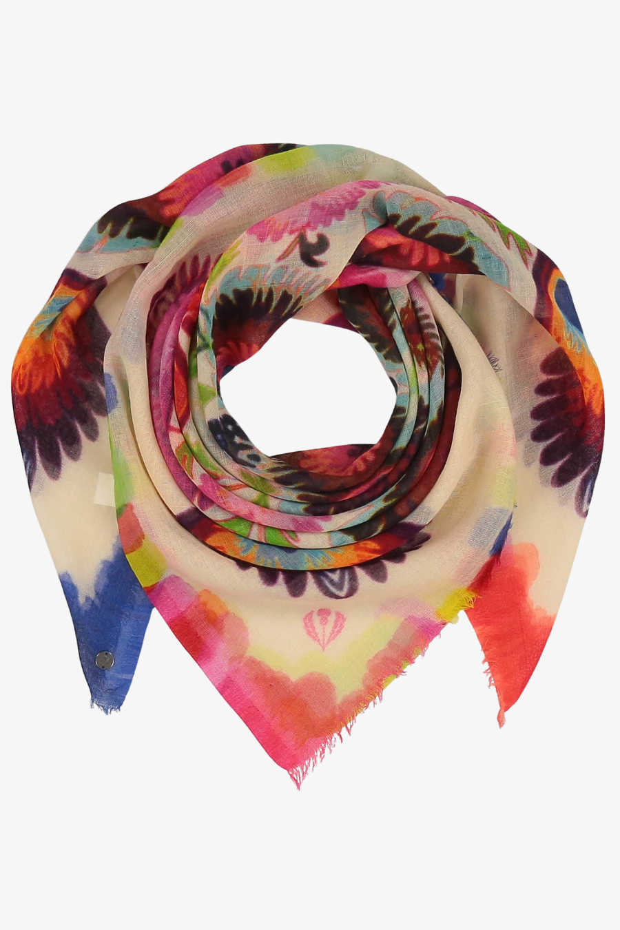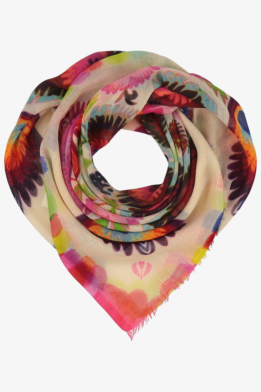 A cosy companion: this FRAAS scarf features a floral print that is reminiscent of colourful peacock feathers. Whether worn with an everyday outfit or a business look - this accessory is a real eye-catcher with any outfit. Measuring 105 x 105 cm, the pure wool scarf can be worn in many different ways: casually as a triangle, thrown over the shoulder as a stole or tied around the neck to keep out the cold.