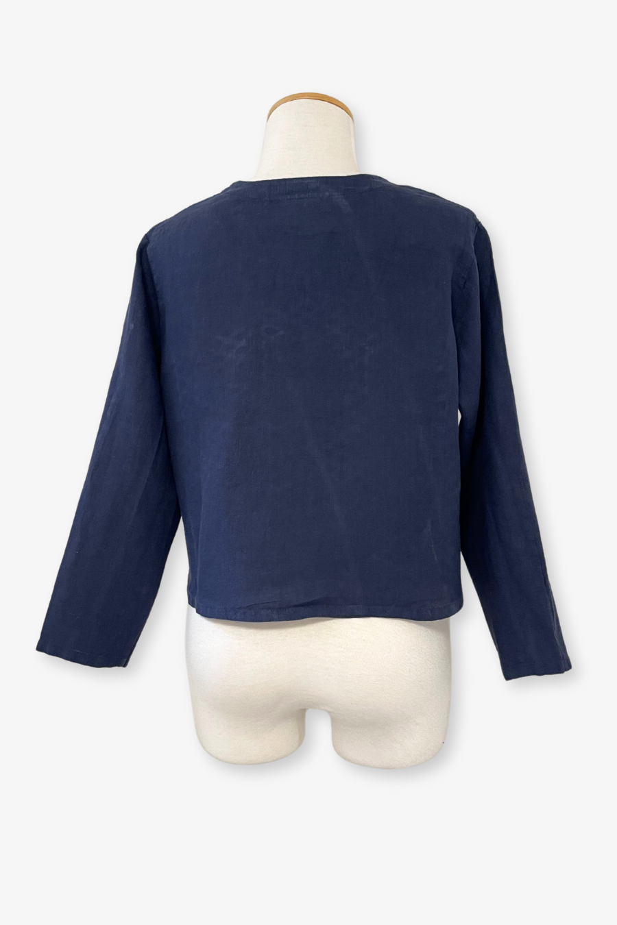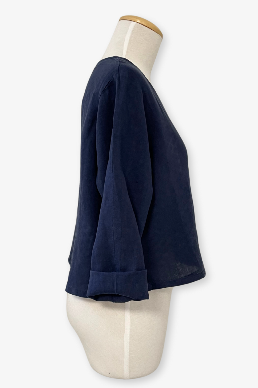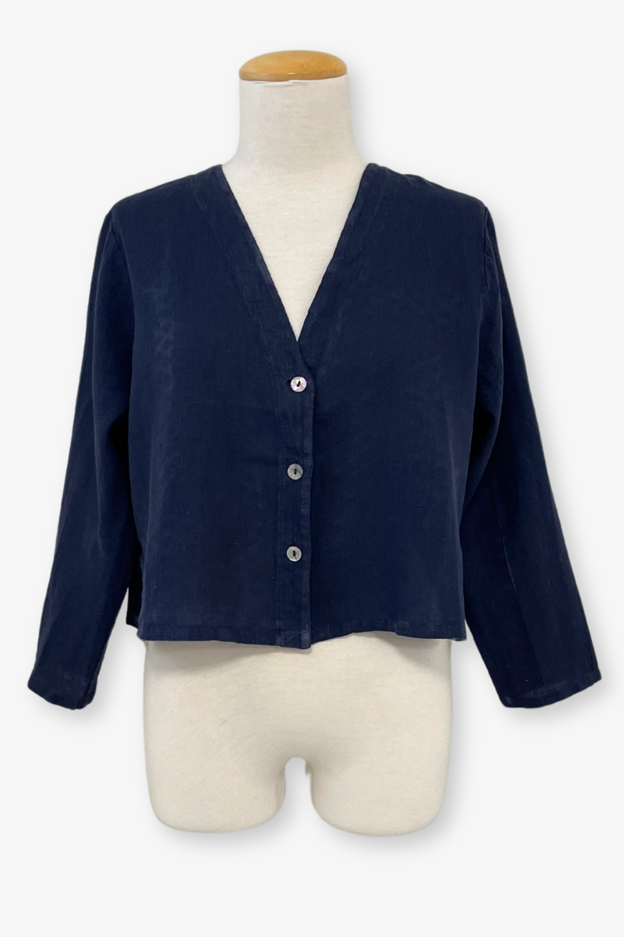 The Cropped V-Neck Cardigan is comfortable and can be dressed up or down. It has a relaxed shape, is slightly cropped, and can easily transition from a casual cardigan to an unstructured jacket.