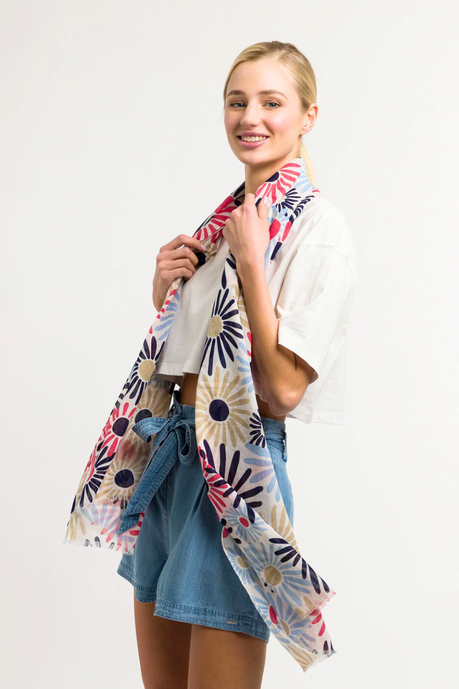 It's not summer without a bold, colourful cotton scarf! The Daisy Power Cotton Scarf is the perfect pop of colour for your summer dresses or favourite jeans. The luxuriously soft cotton in it makes it lightweight, durable, and breathable. A great scarf to pack in your beach bag or for a quick stop on the patio! Try it as a cotton wrap shawl, classic scarf, or let it hang down in the breeze.