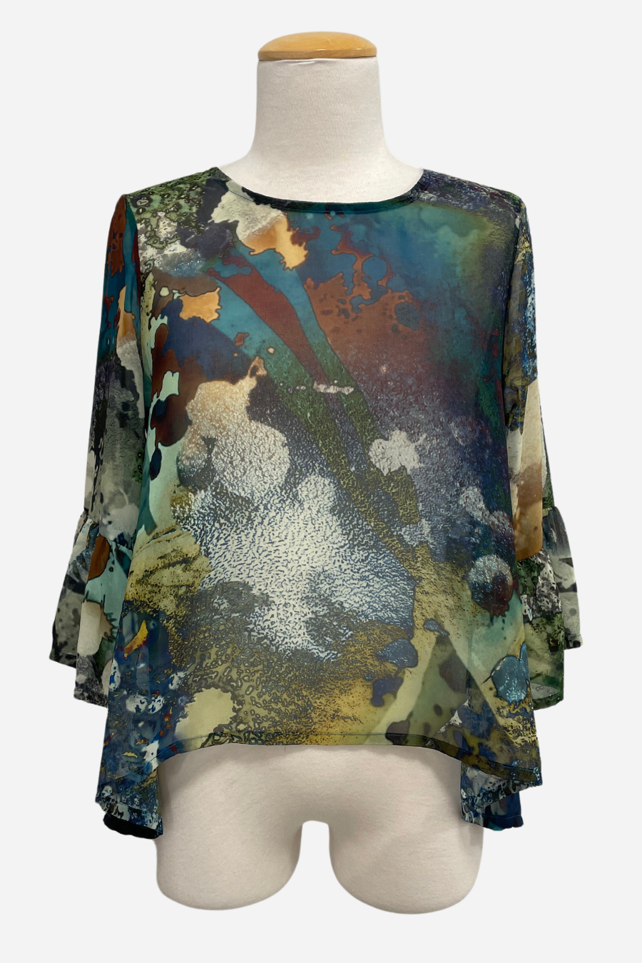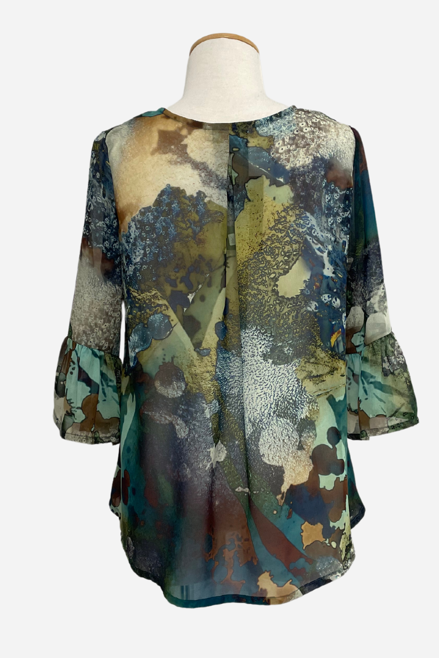 The Fran Shirt has a round neckline and a flirty ruffle at the three quarter bell sleeves. An inverted pleat below the back neckline and a curved high/low hemline complete the cute and easy fitting look.