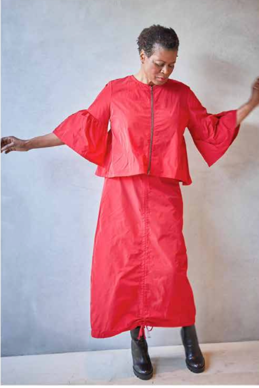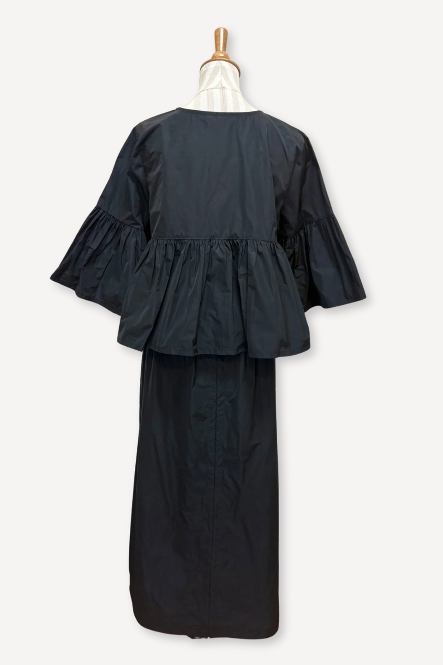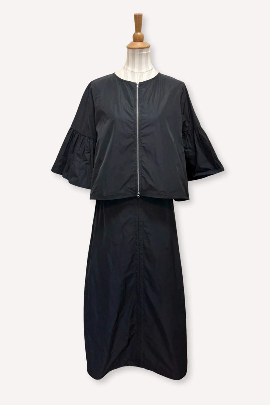 The Frida jacket in memory crunch fabrication features a round neckline , 3/4 ruffle bell sleeves, back horizontal seam, relaxed fit , front two way zip closure , approx. 22" length.