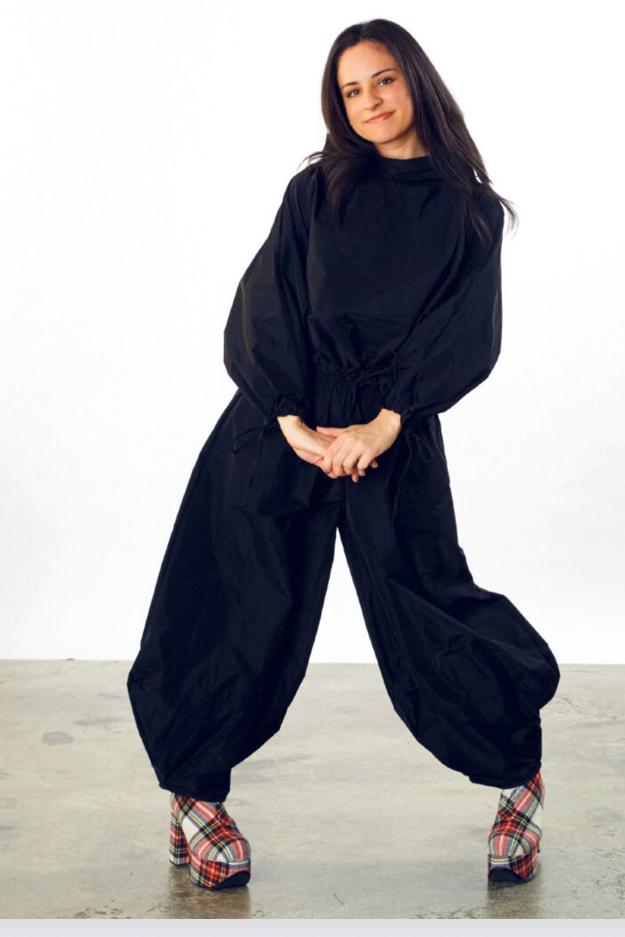 Long dolman sleeve shirt with a draping collar, cinched wrist and waist hem, with an overall boxy fit.