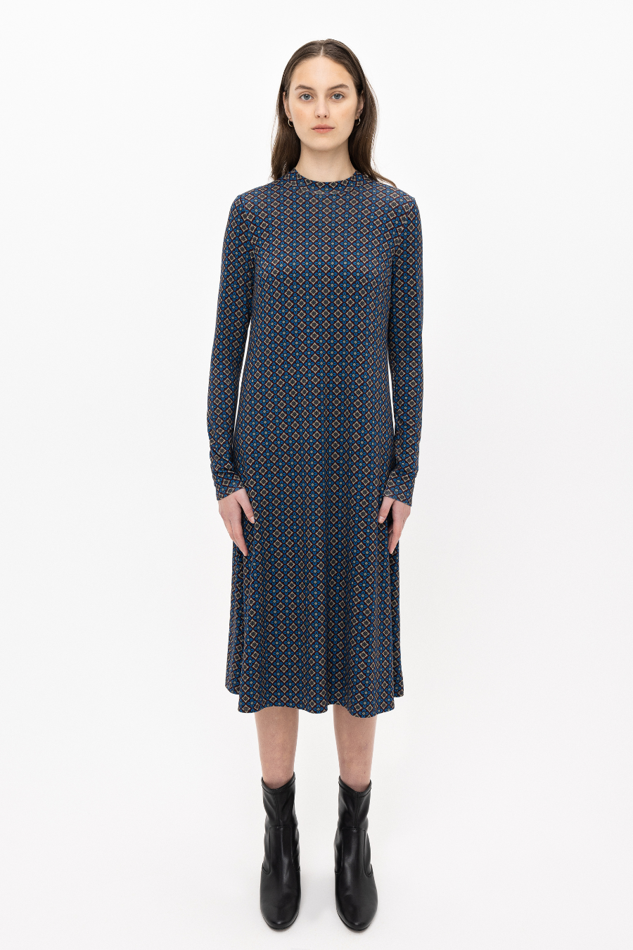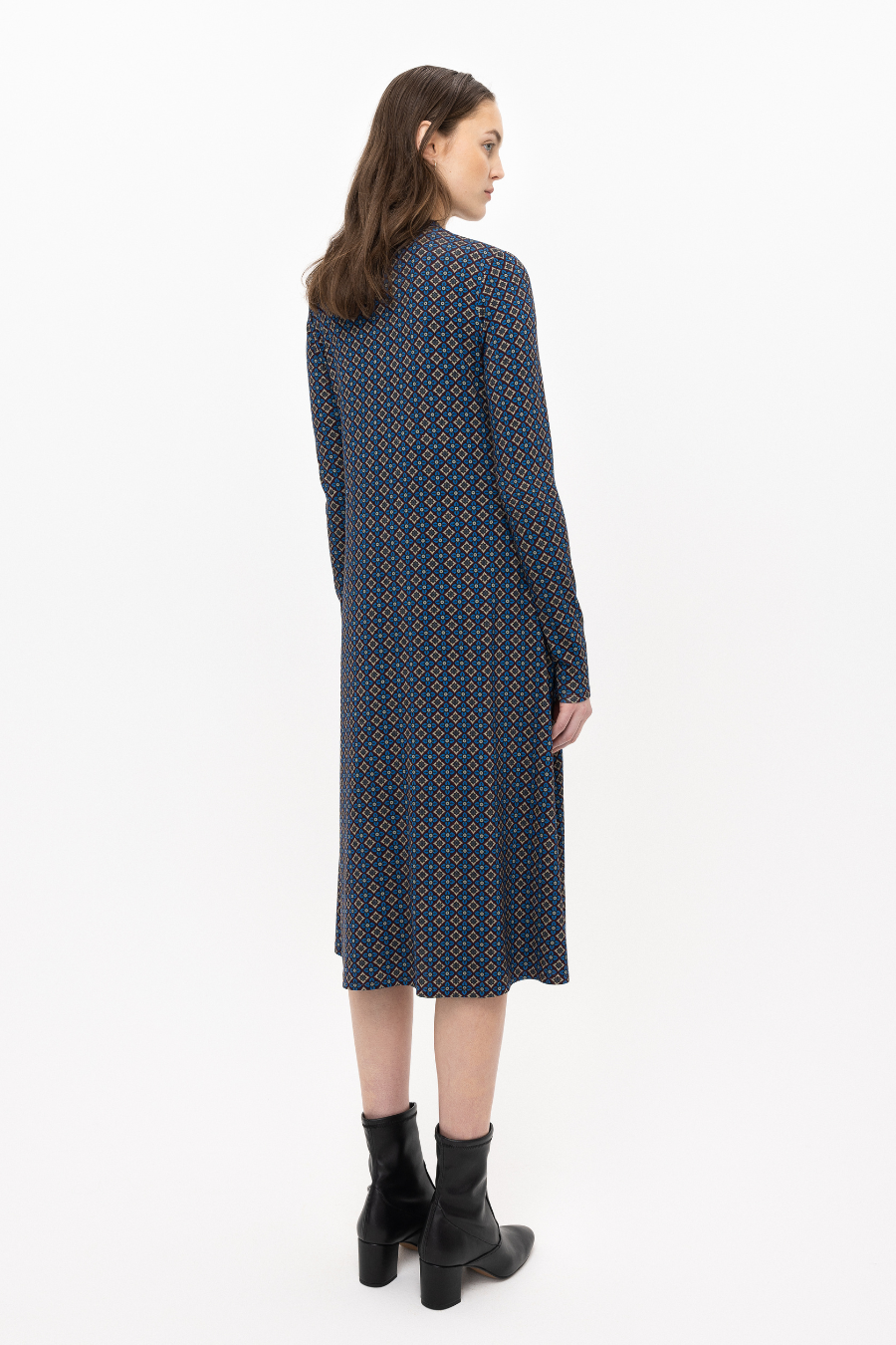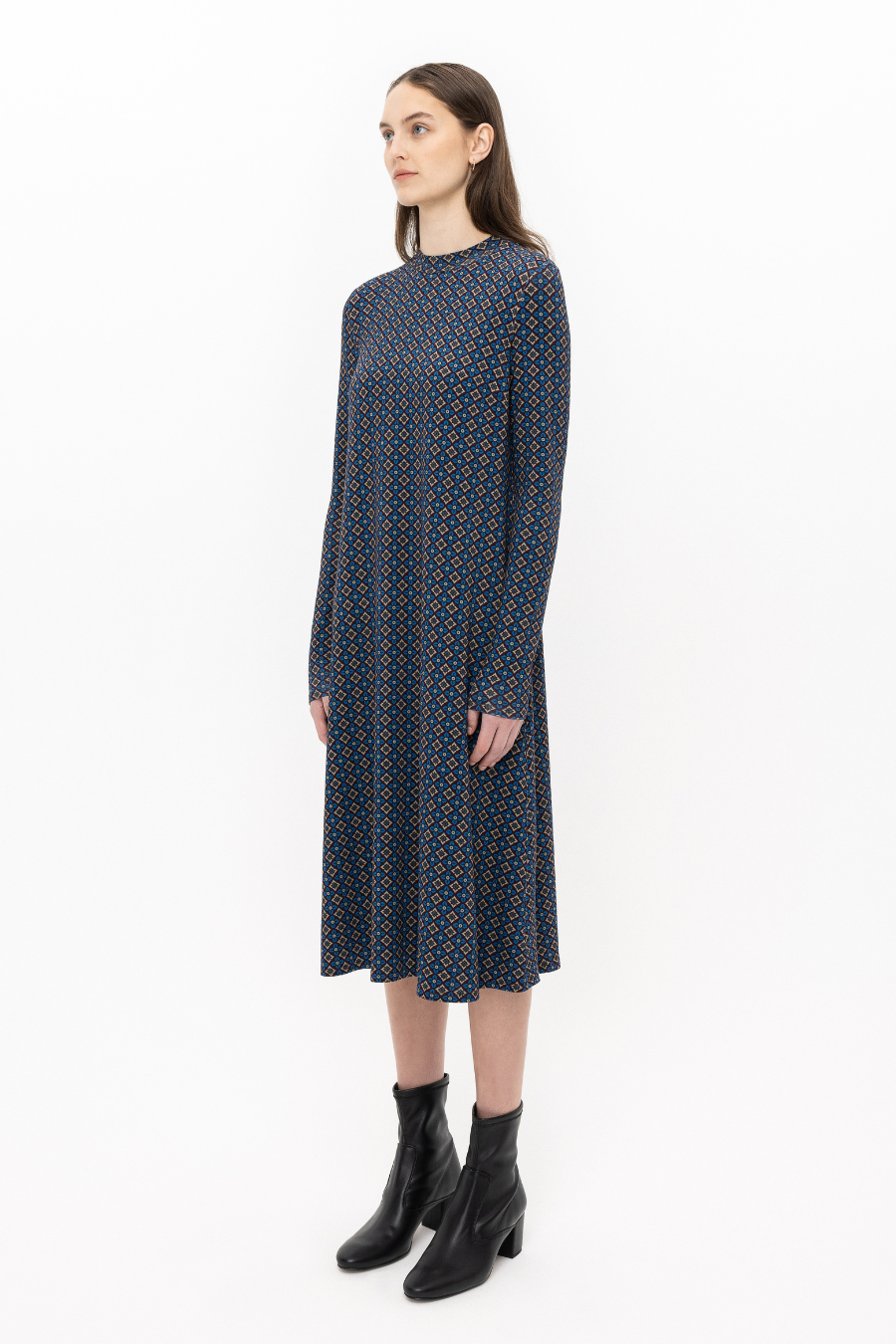 An effortless lounging dress, JADA is cut from a liberating jersey, printed with a geometric motif reminiscent of historical architecture and decorative arts.