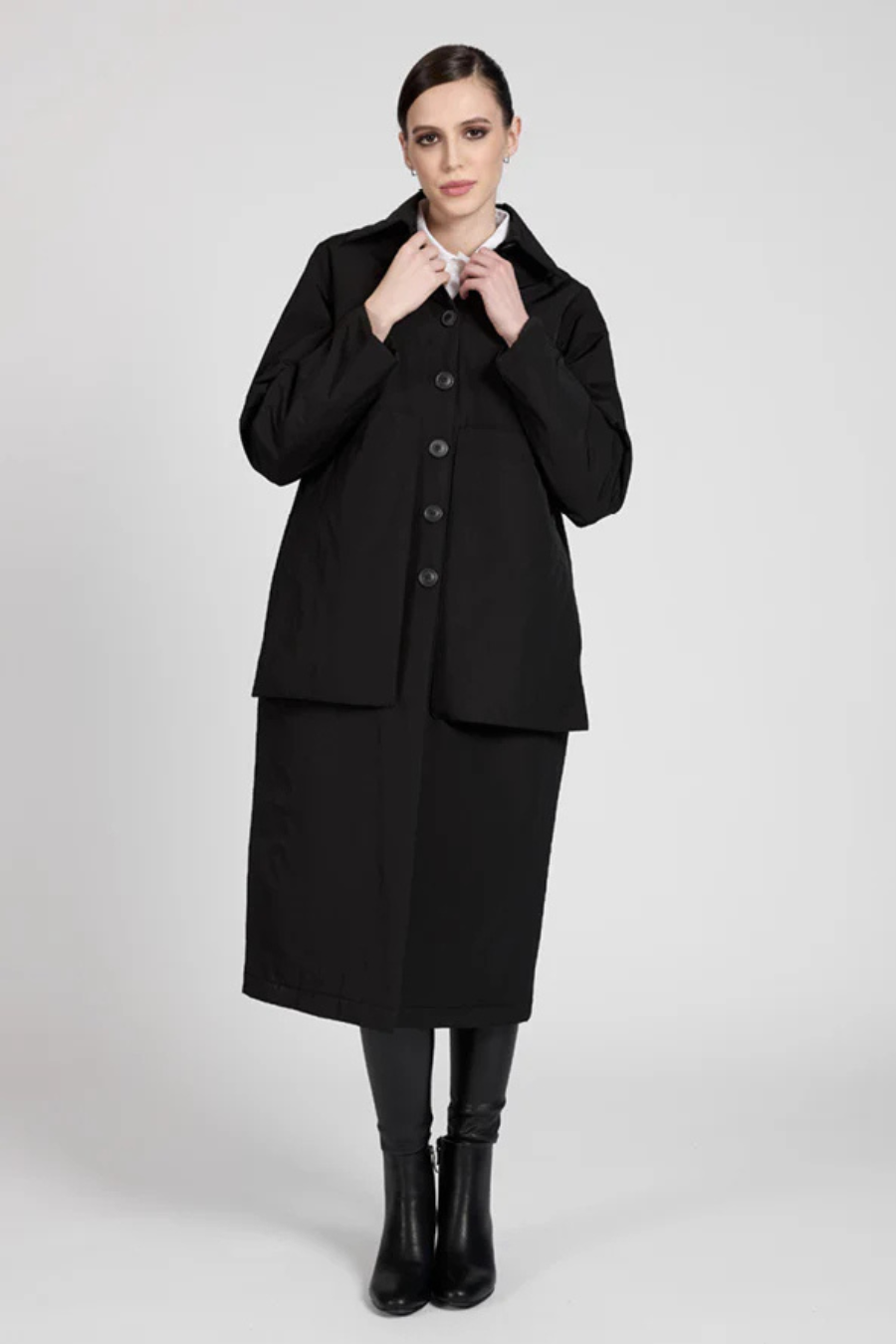 A straight car coat style light weight puffer coat with large front floating pockets and quilted lining.