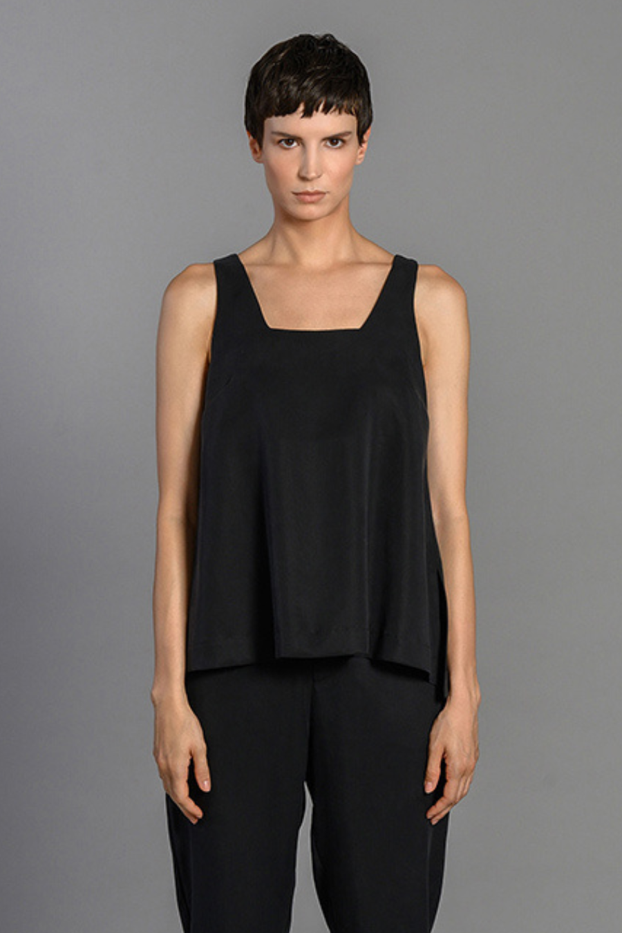 Tank top with side slits, wide straps and a square bust.