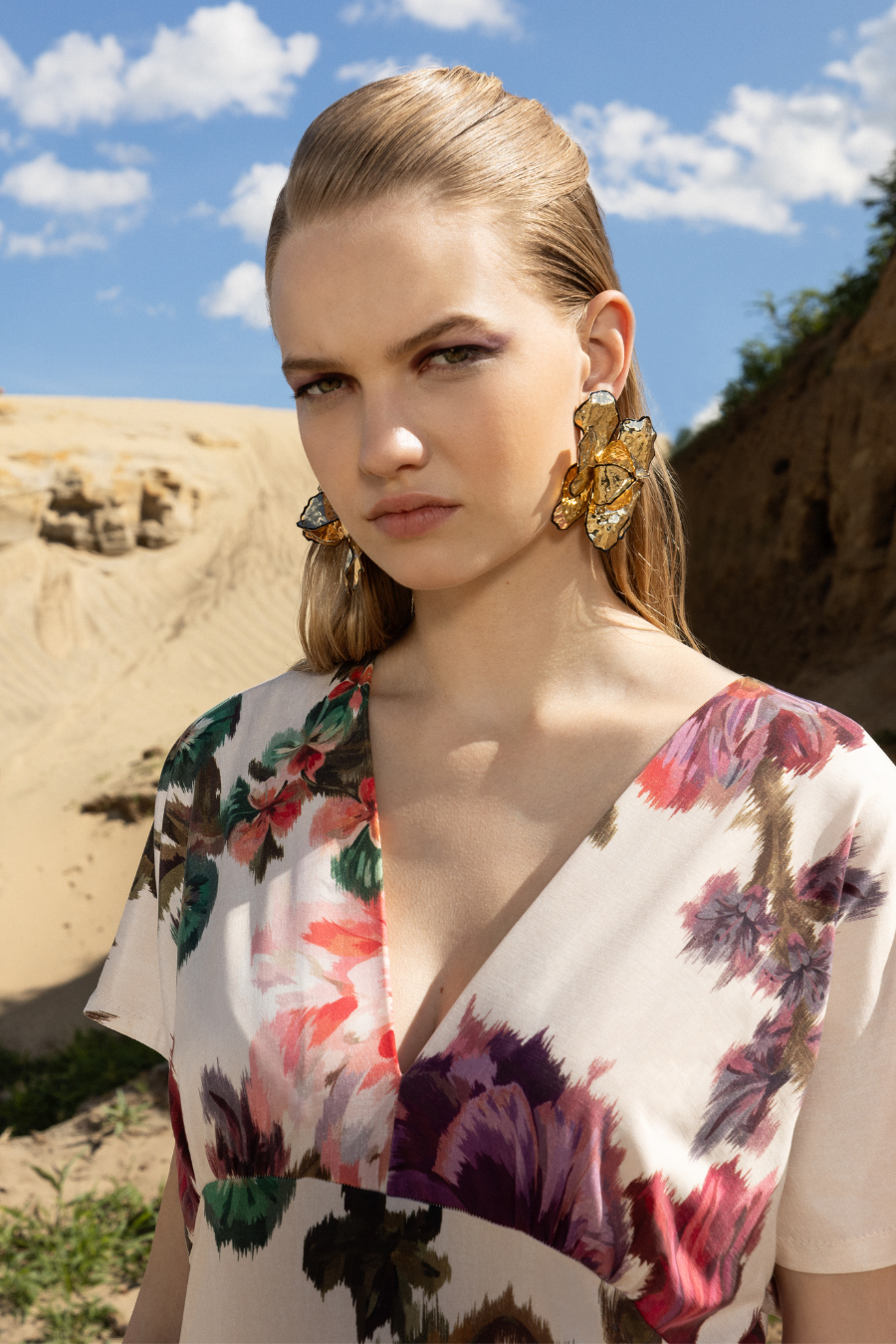 The fabric blend ensures a breathable yet structured fit, offering all-day comfort and graceful movement. We recommend a delicate wash cycle and flat drying to preserve the shape and print quality. Avoid tumble drying for best results.