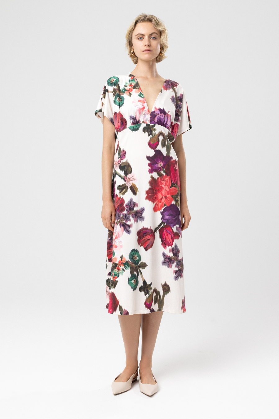 Designed with a flattering empire waist and delicate pleats at the bust, PASSION enhances the silhouette with softness and elegance. Its V-neckline adds a refined touch, while the short, wide sleeves bring ease and lightness to every movement. The fit-and-flare shape, paired with a below-the-knee length, makes this dress a versatile piece—effortlessly chic for any occasion.