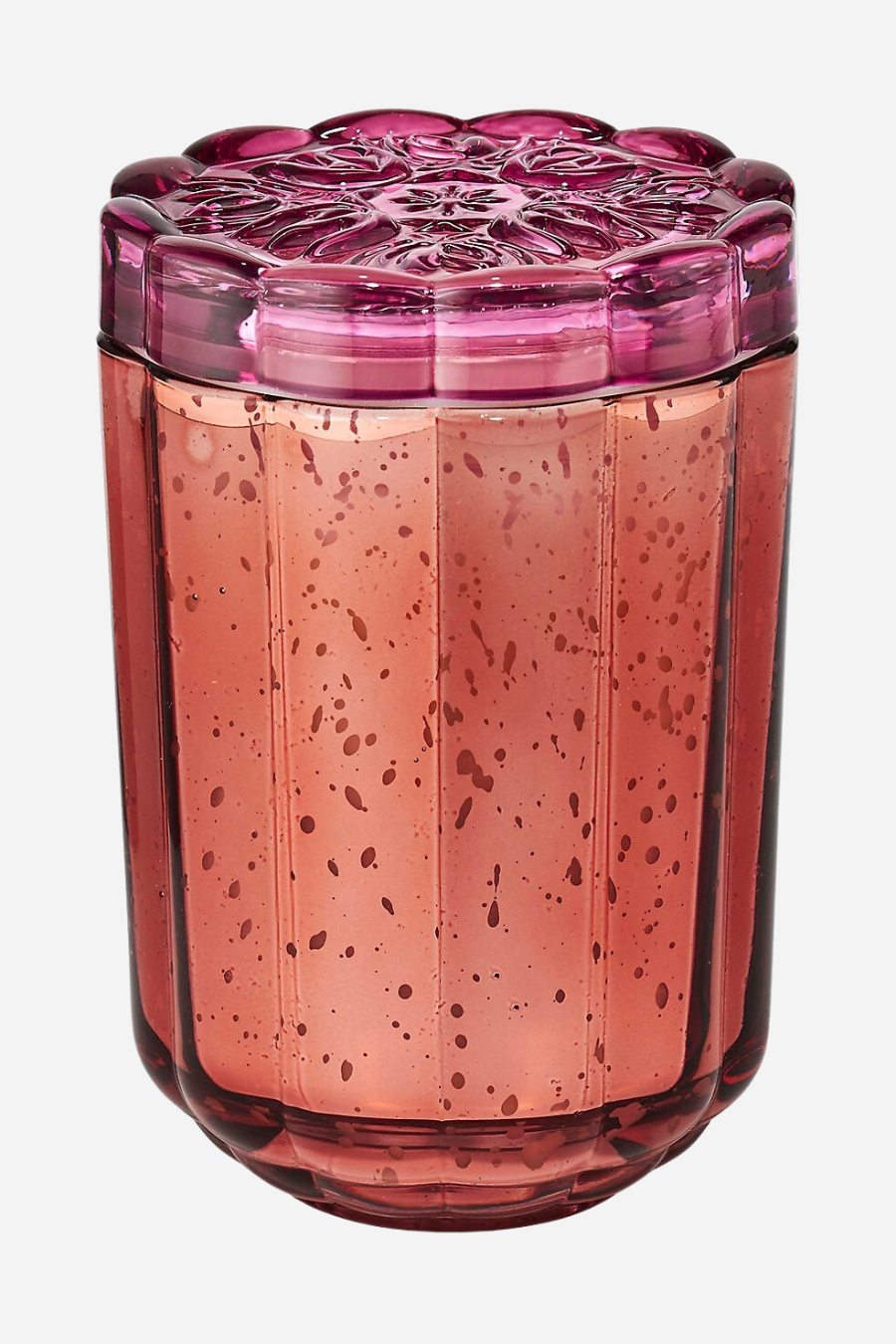 A lightly speckled mercury glass with a pressed glass, floral-shaped lid. A fragrance of tropical fruit, pink pepper, and vivacious rose. Its vessel is made in China and wax poured in the USA.