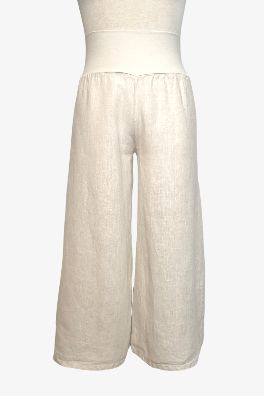 The Ella pant is in high rise, linen pant featuring a wide stretchy waistband, flared wide silhouette, slightly cropped fit.
