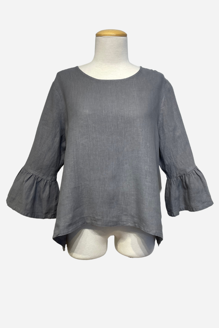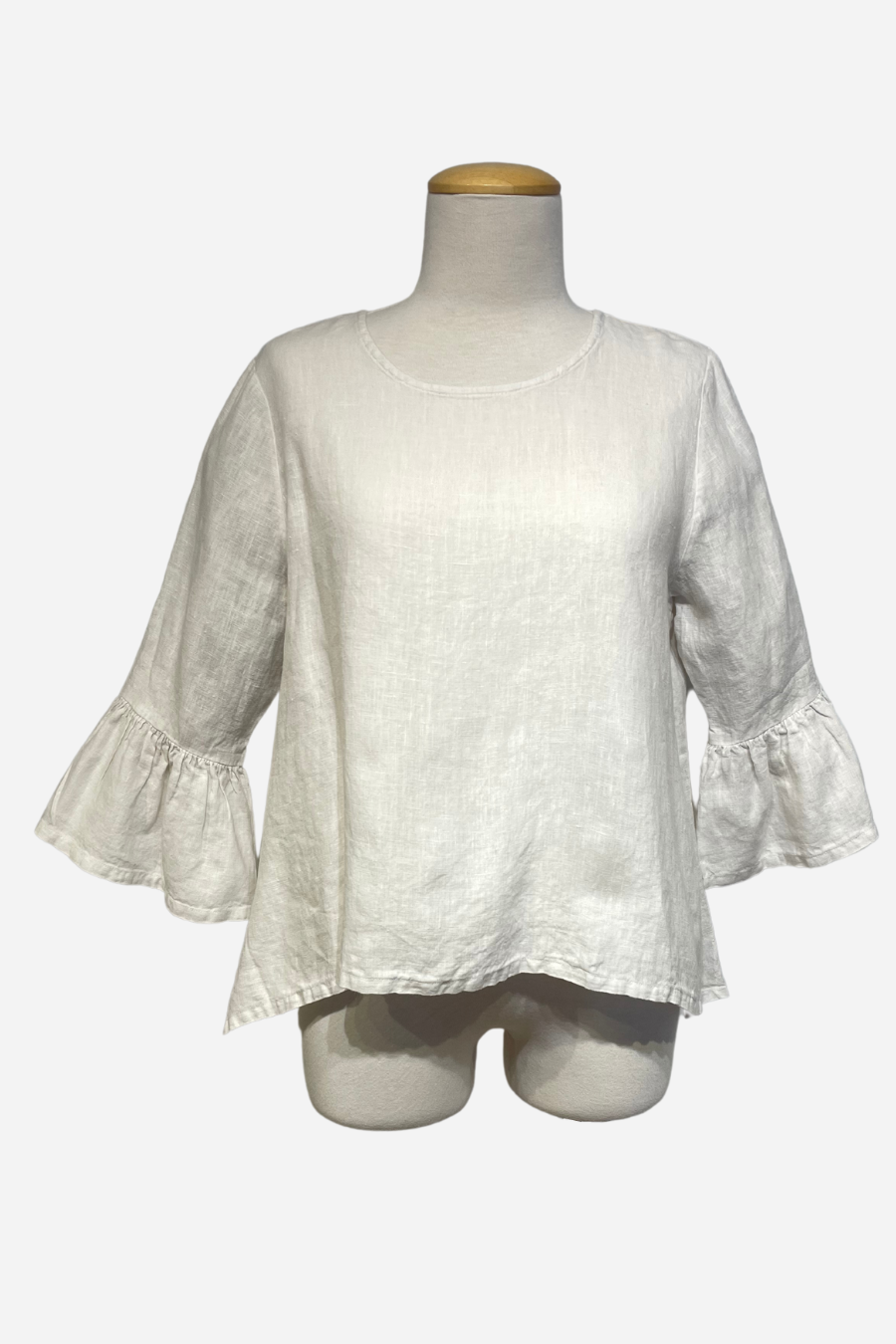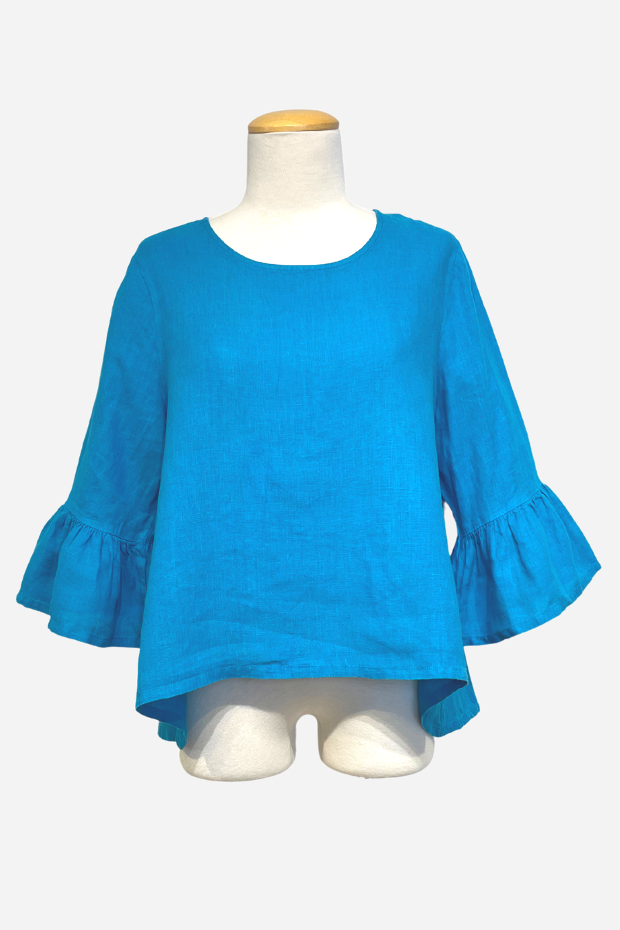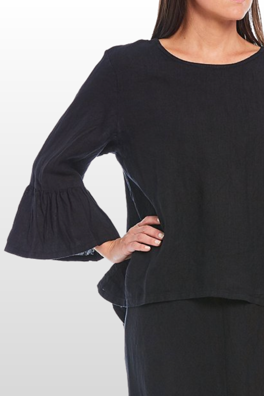 The Fran Shirt has a round neckline and a hint of ruffle at the three quarter bell sleeves. An inverted pleat below the back neckline and a curved high/low hemline complete the cute and easy fitting look.