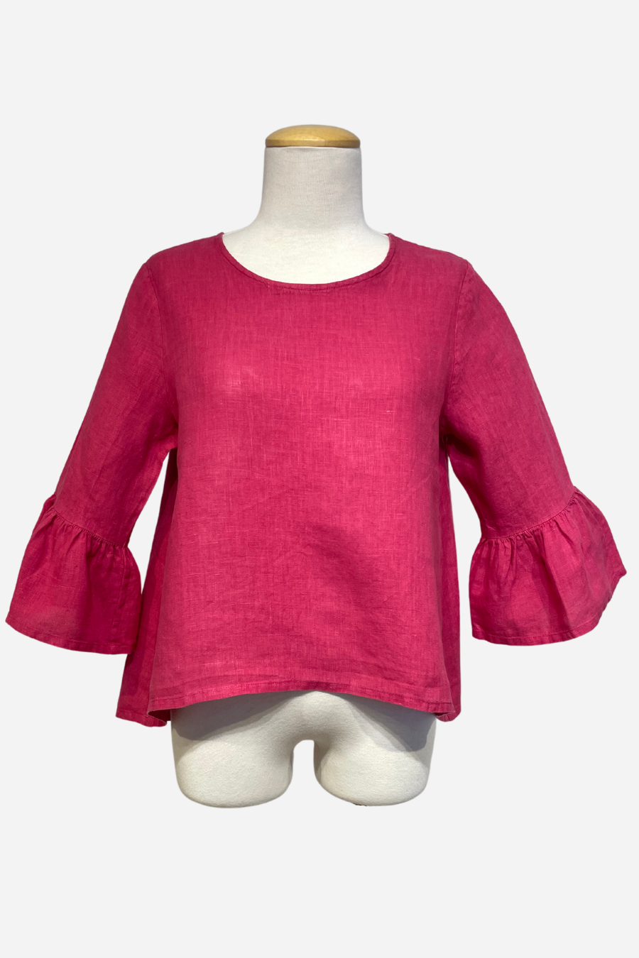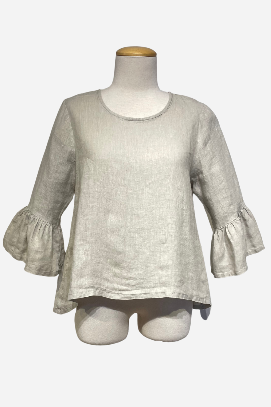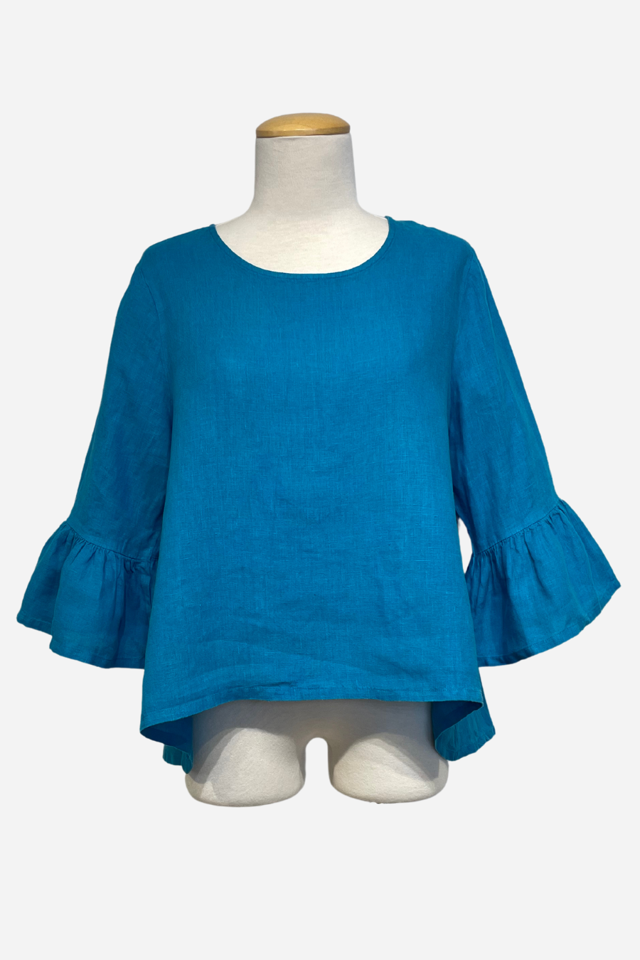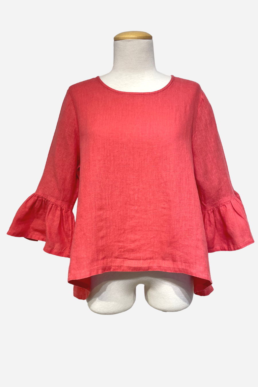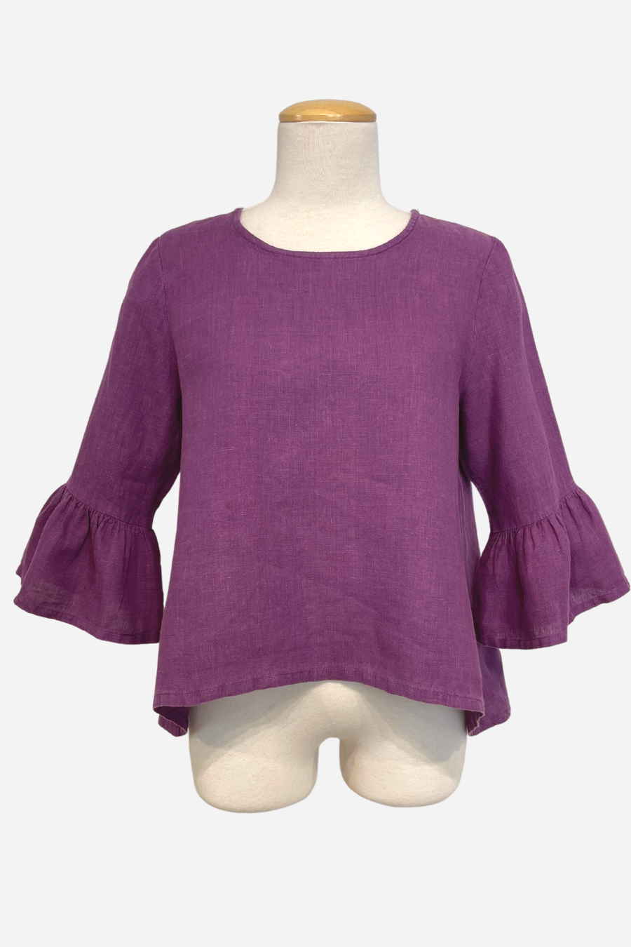 The Fran Shirt has a round neckline and a hint of ruffle at the three quarter bell sleeves. An inverted pleat below the back neckline and a curved high/low hemline complete the cute and easy fitting look.