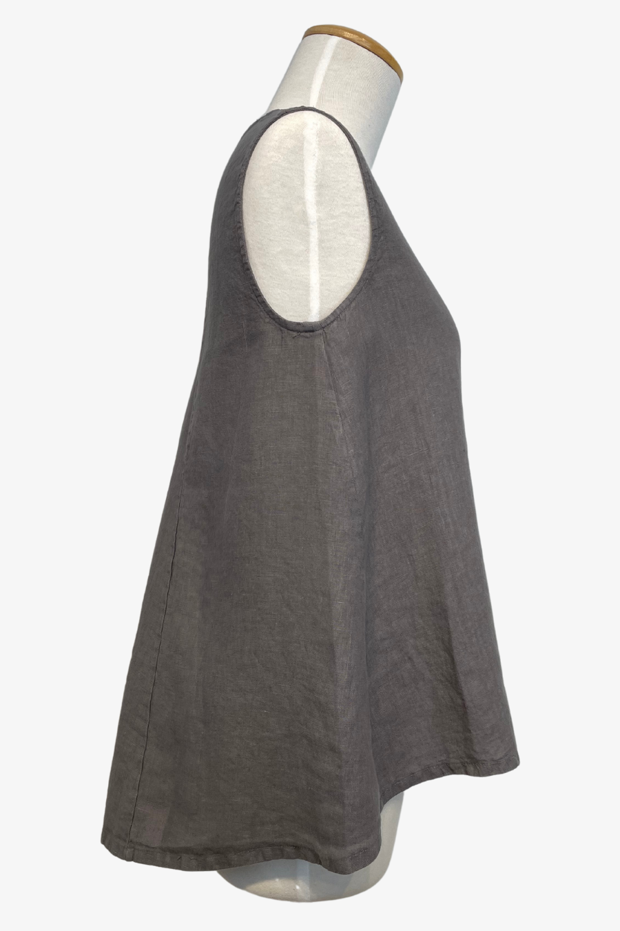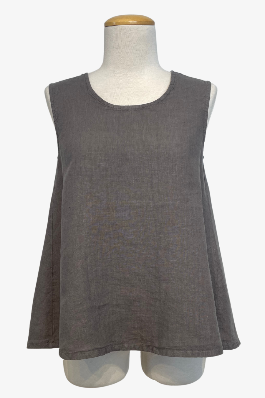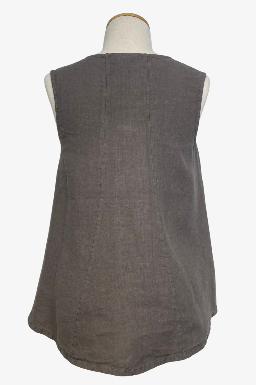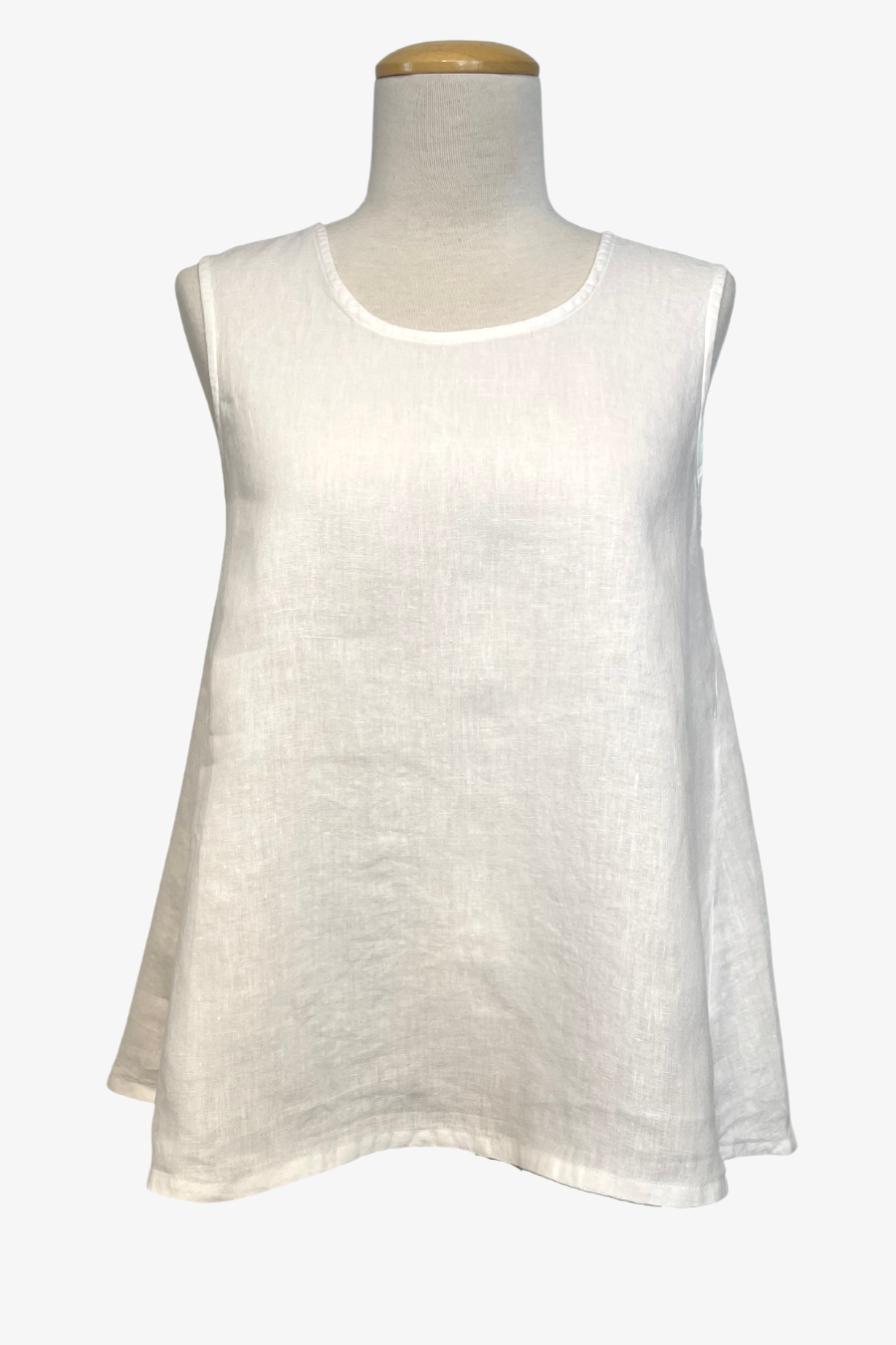 Light linen soft tank with flare cut. Scoop neck and slight cap sleeve. Two angled vertical seams down back give structure. Sizes run large so go down a size when ordering.