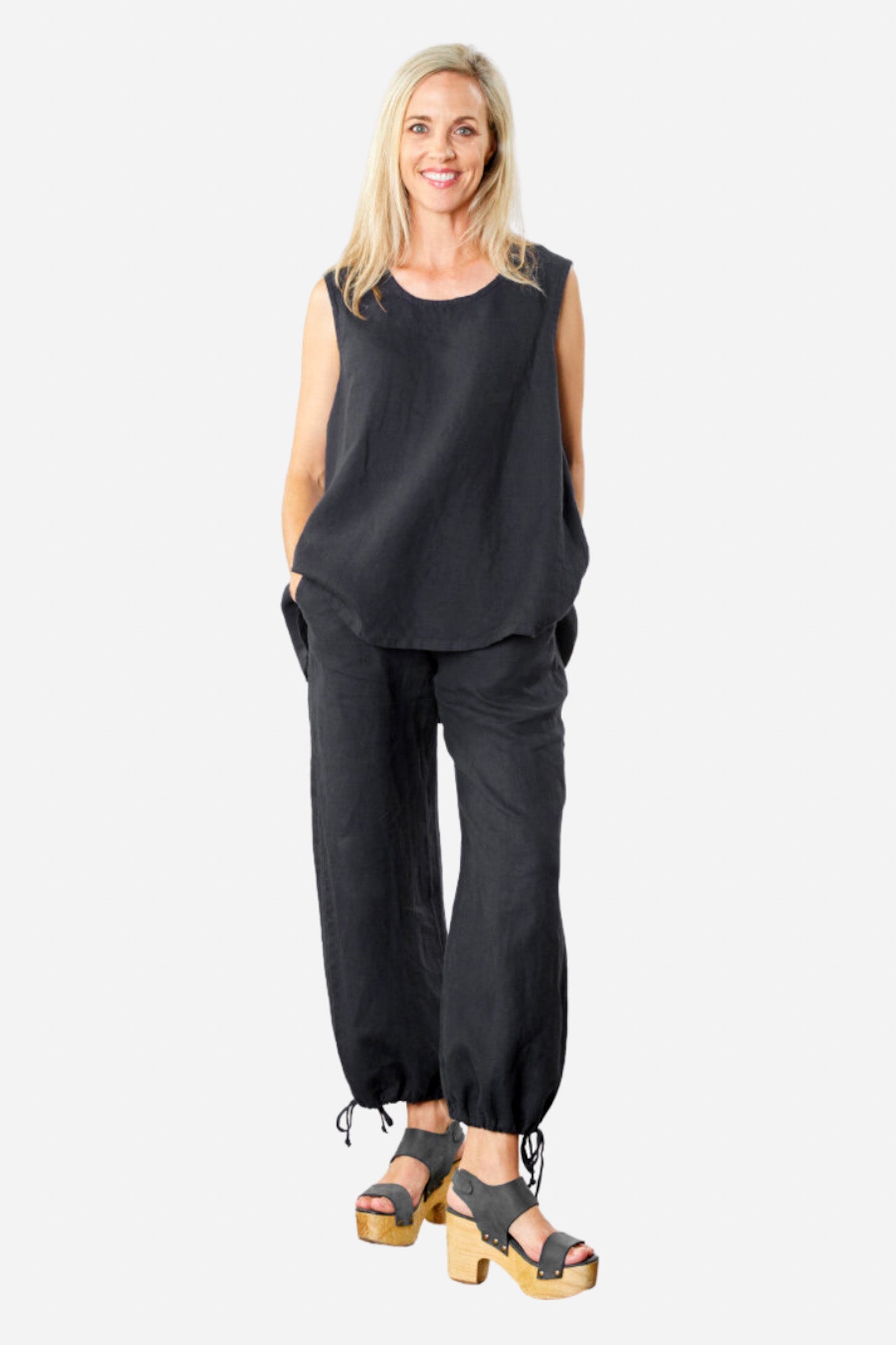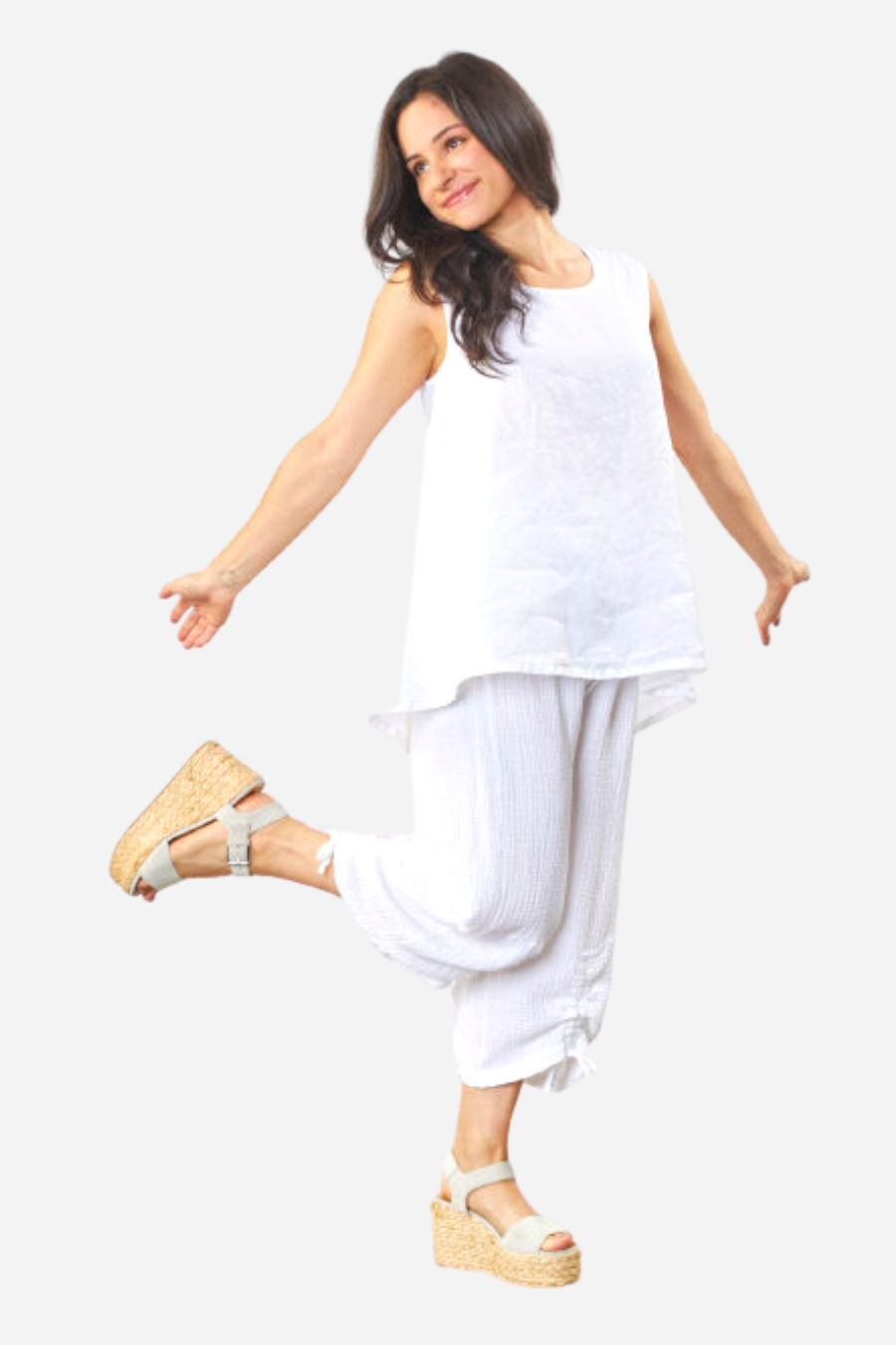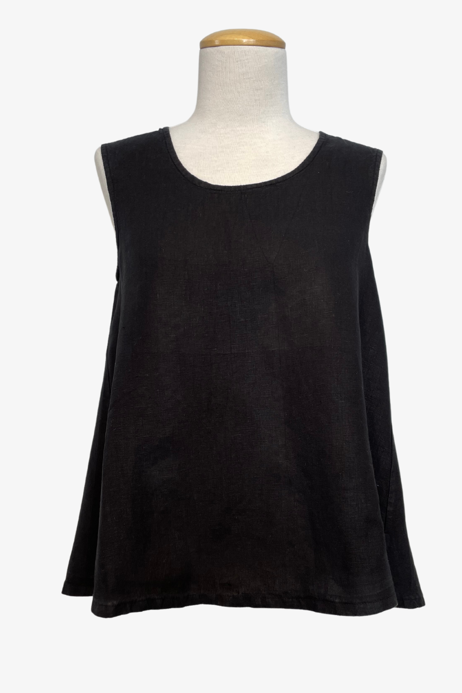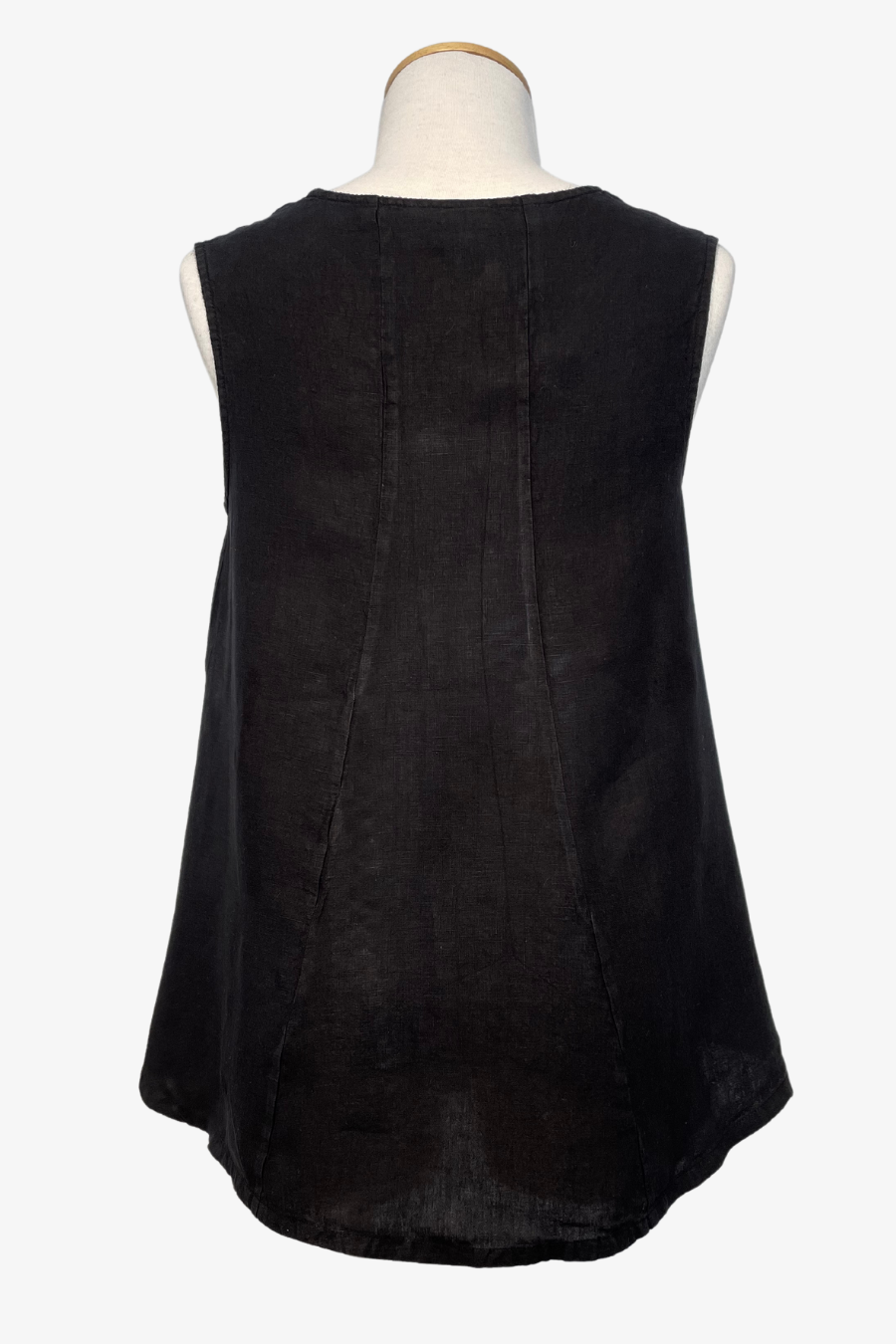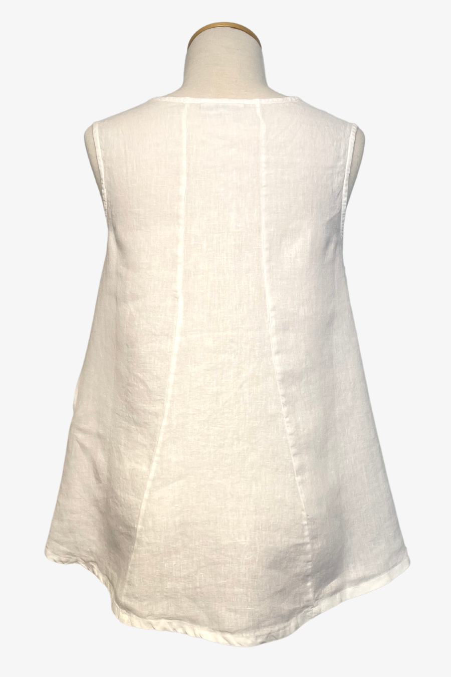 Light linen soft tank with flare cut. Scoop neck and slight cap sleeve. Two angled vertical seams down back give structure. Sizes run large so go down a size when ordering.