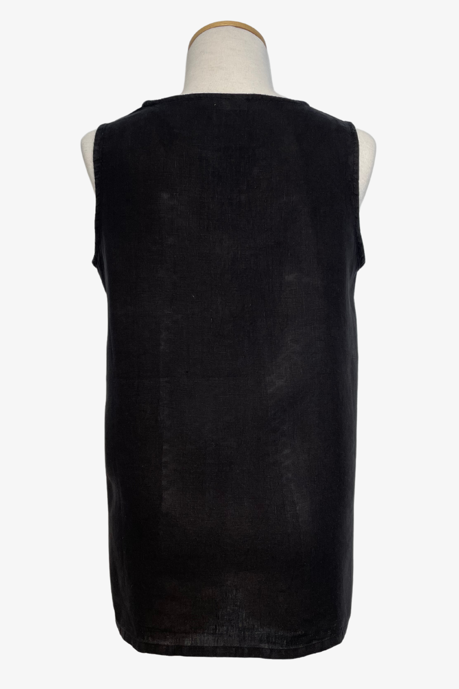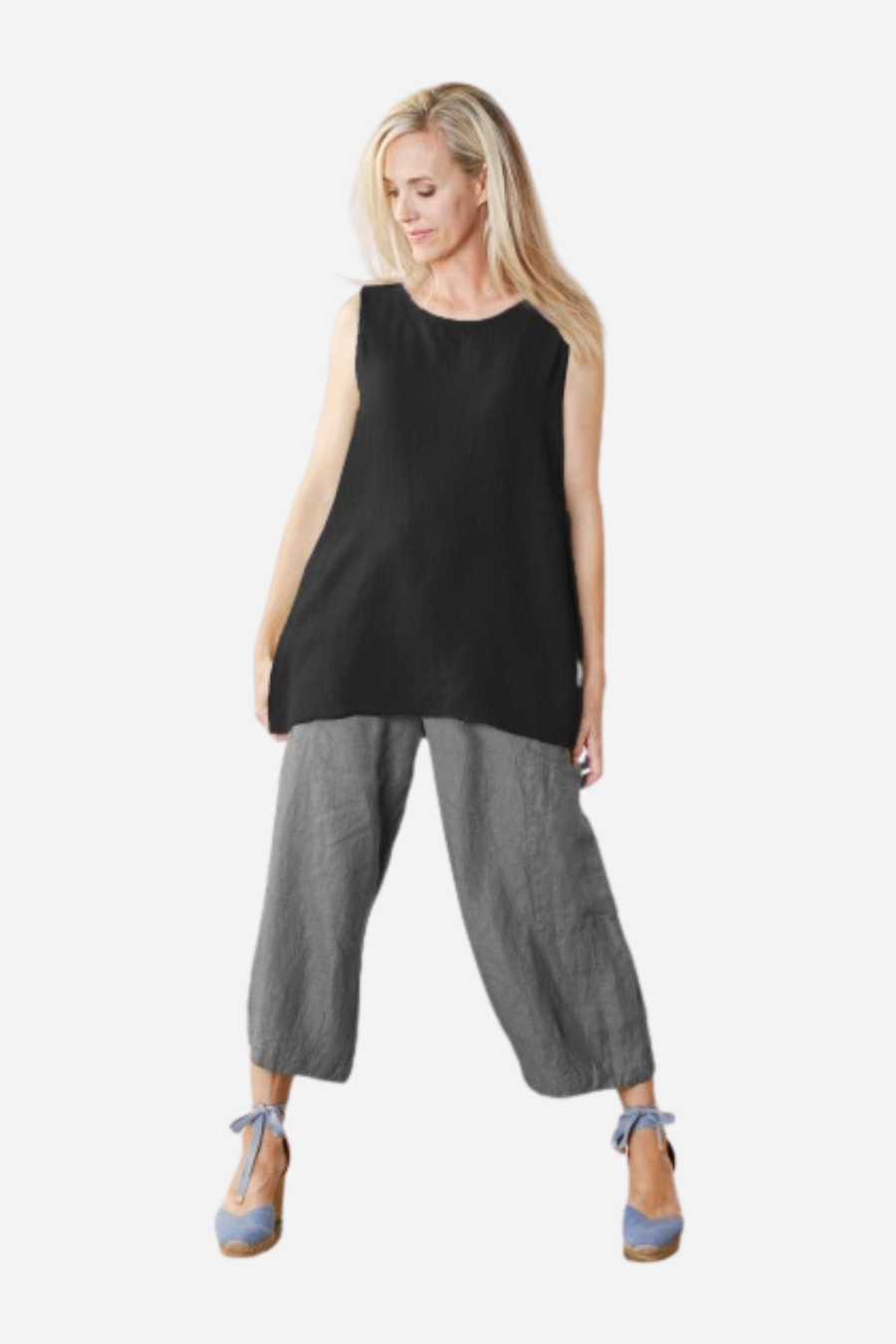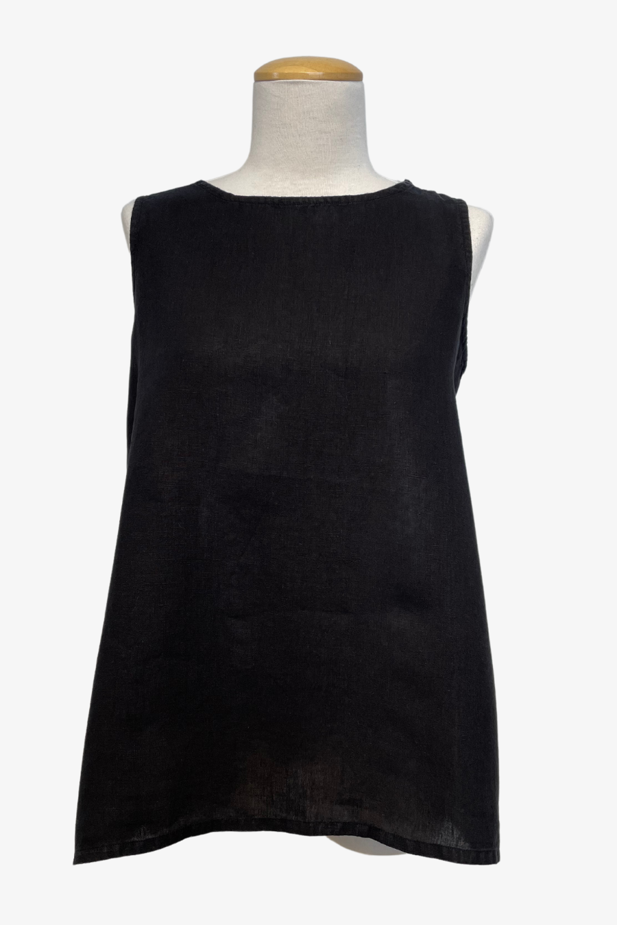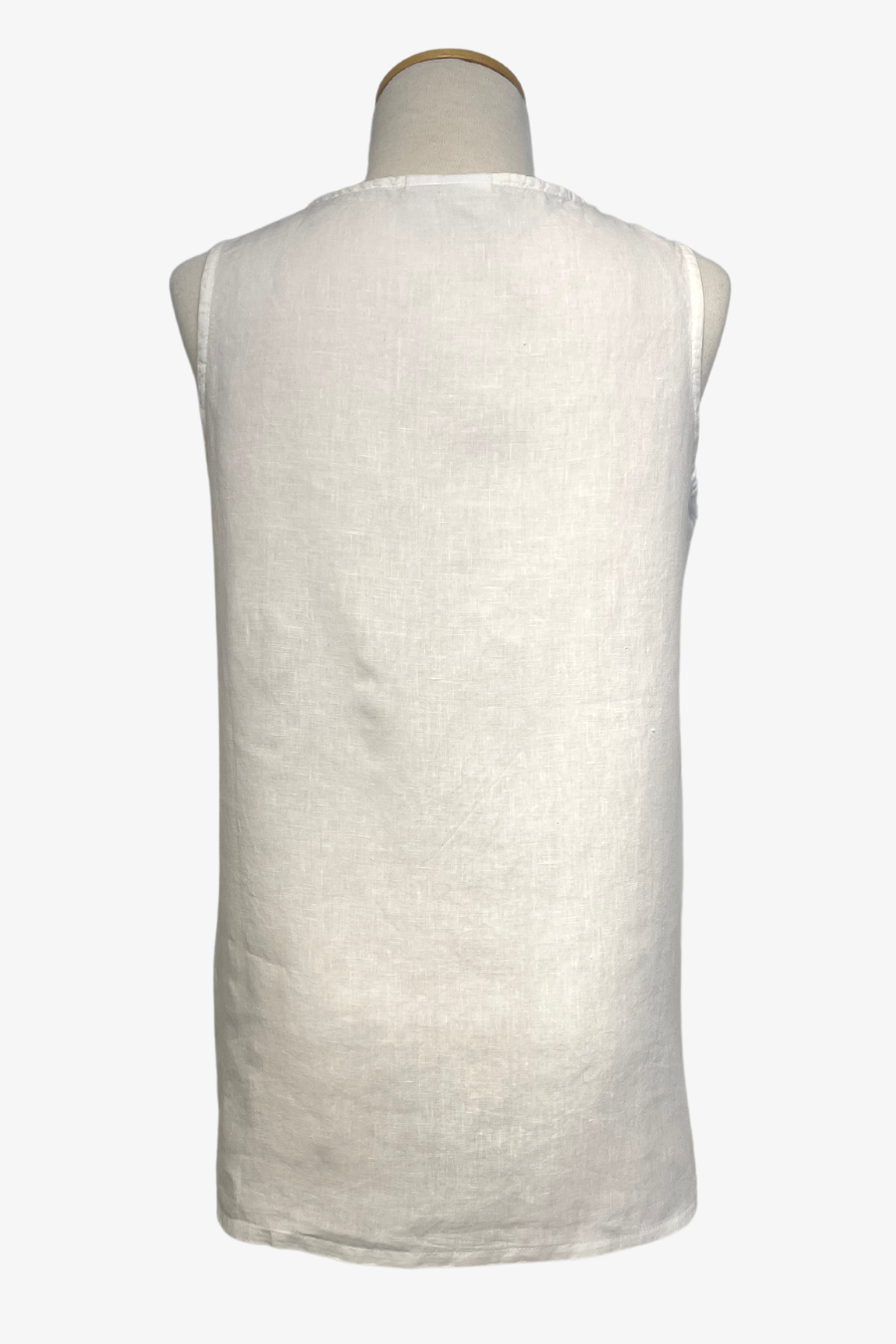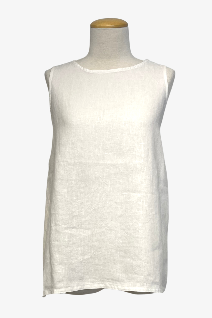 The Pira Tank in light linen has a round neckline and straight hemline.