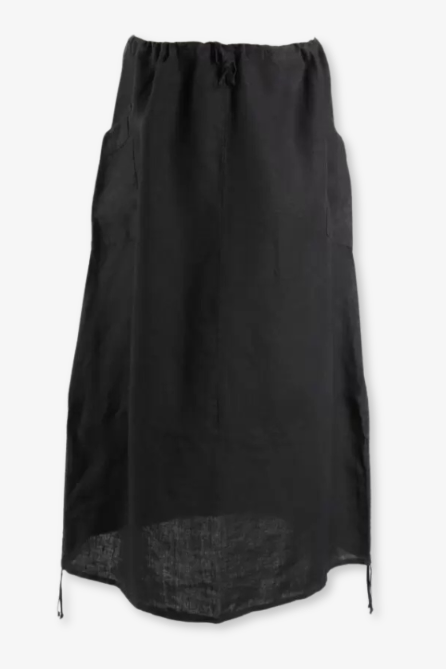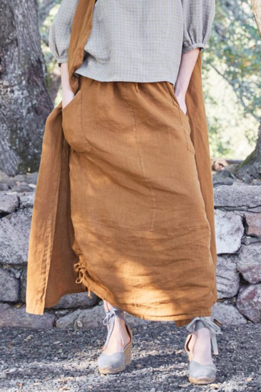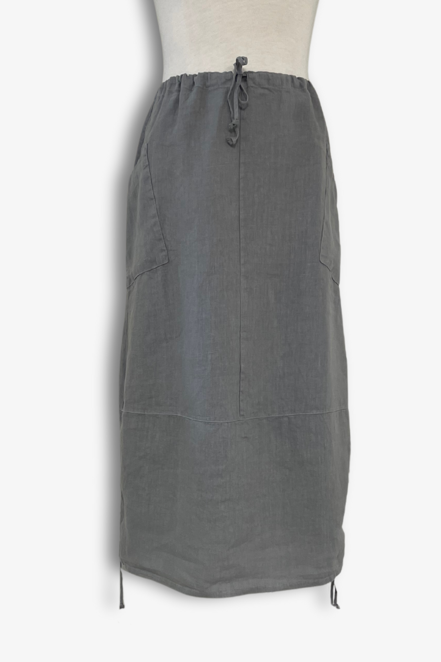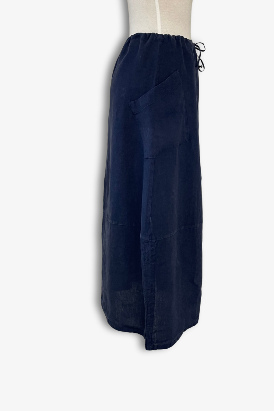 A minimalist essential, the Shelby Skirt is a maxi skirt made from breathable lightweight linen, drawstrings at the waist and hem. Details also include deep angled pockets, big enough to carry your phone and seams that run down the middle and horizontally at the bottom of the skirt.
