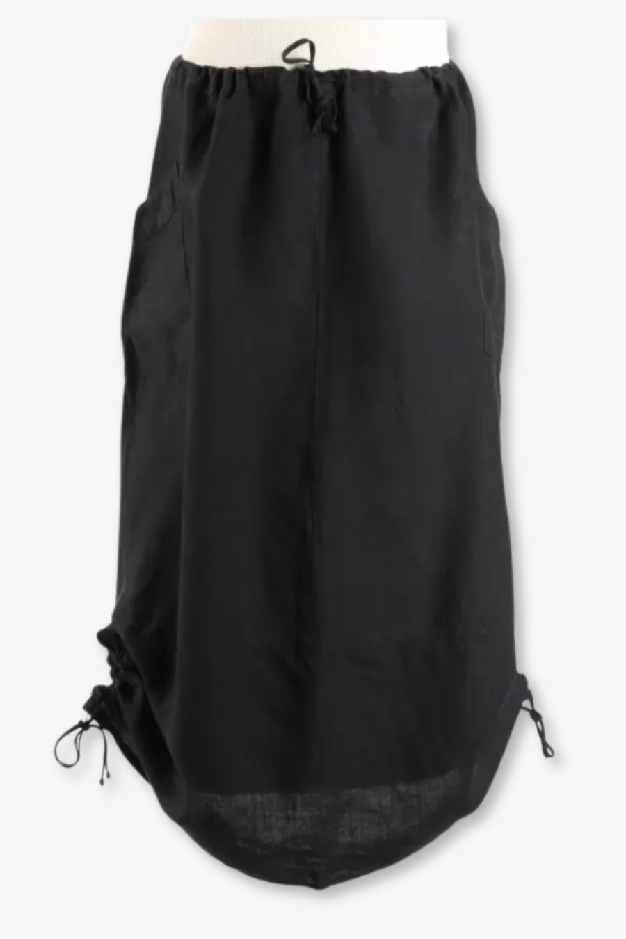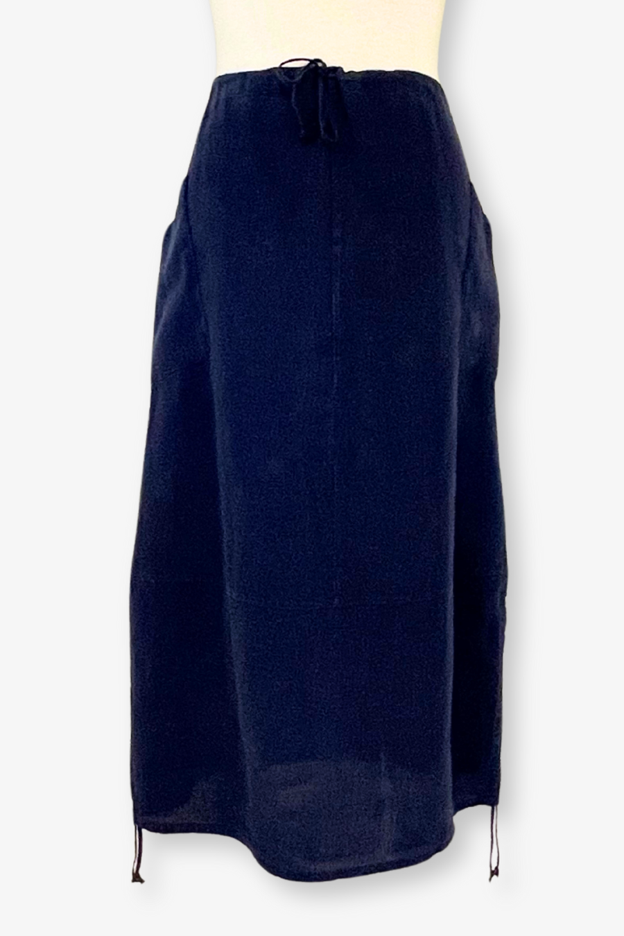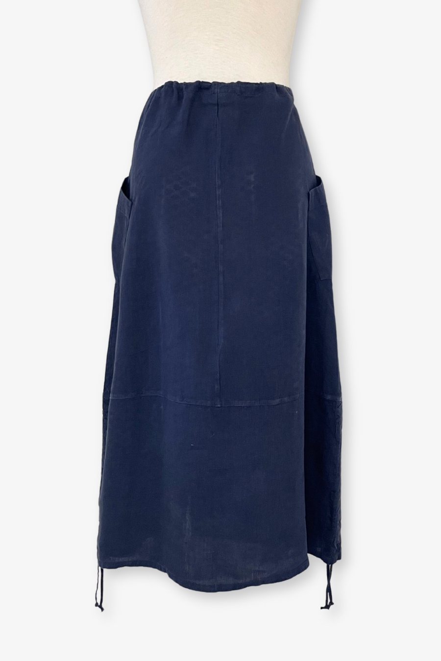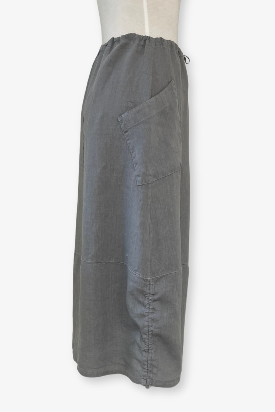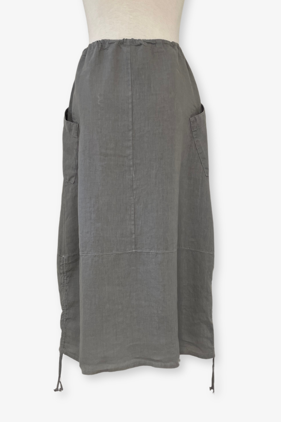 A minimalist essential, the Shelby Skirt is a maxi skirt made from breathable lightweight linen, drawstrings at the waist and hem. Details also include deep angled pockets, big enough to carry your phone and seams that run down the middle and horizontally at the bottom of the skirt.