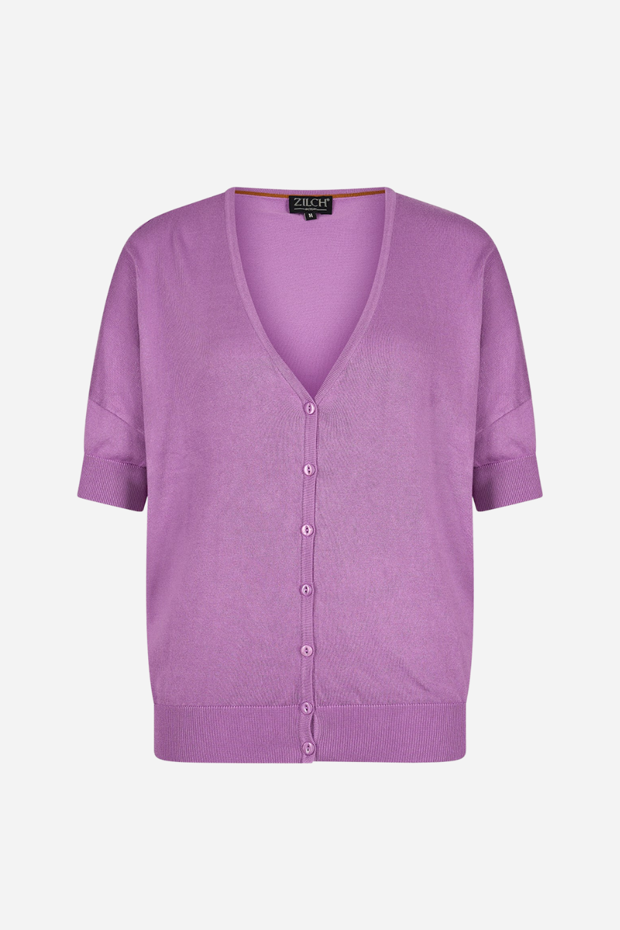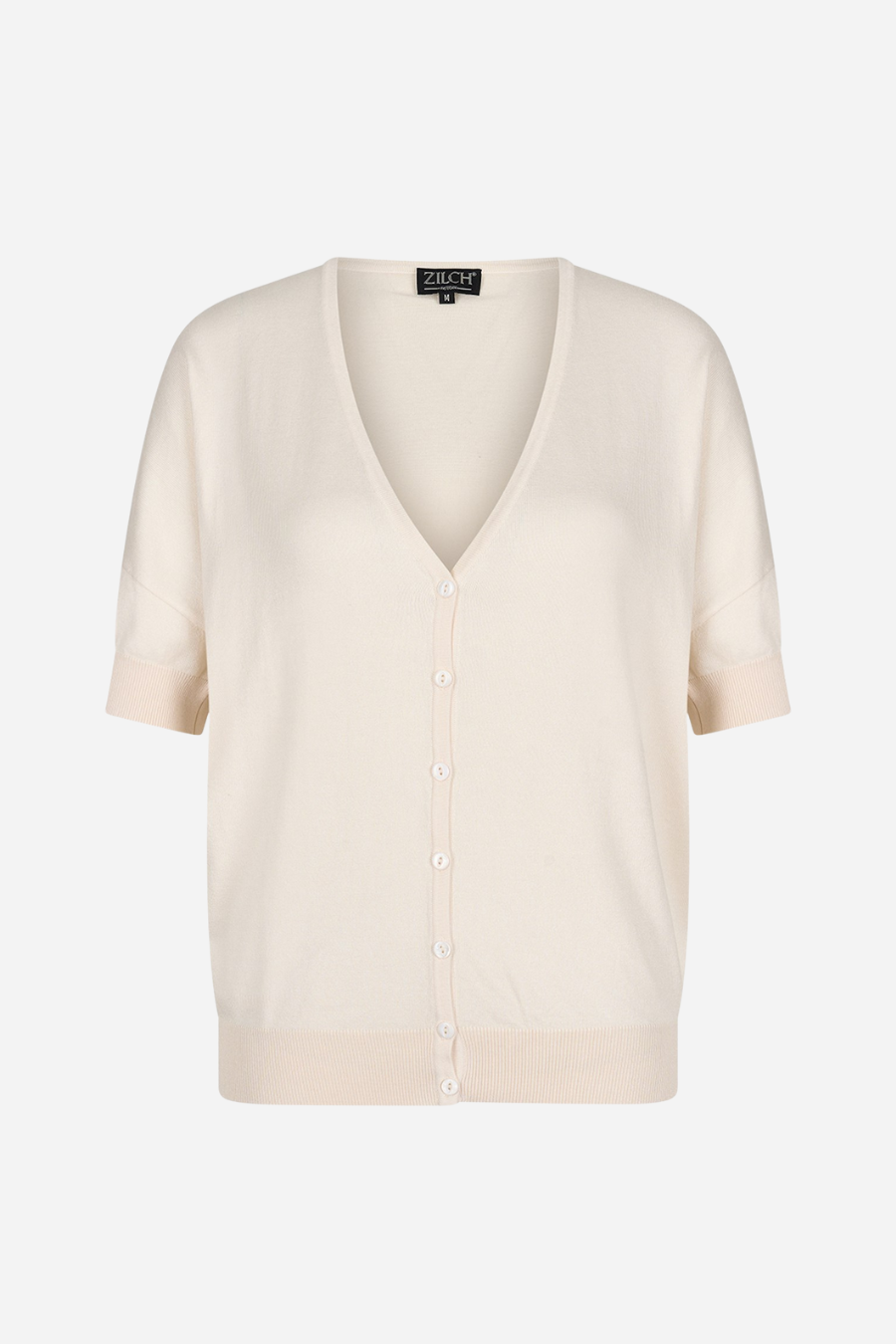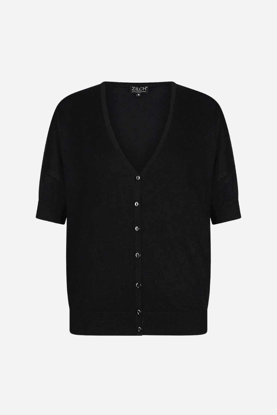 A slightly looser cardigan made of wonderfully soft bamboo with short sleeves with collar and dropped shoulder seam. This cardigan has a v-neck, a button closure
