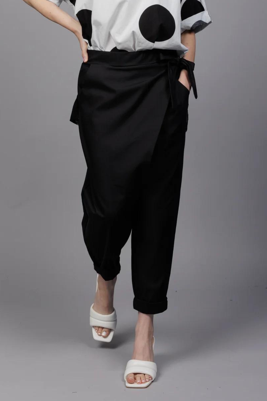 The Paolo Tricot Cross Over Pant has a taper leg with a flat front and elastic back waistband for amazing comfort. It features a crossover panel that attaches with tie at the side. It also has side pockets.