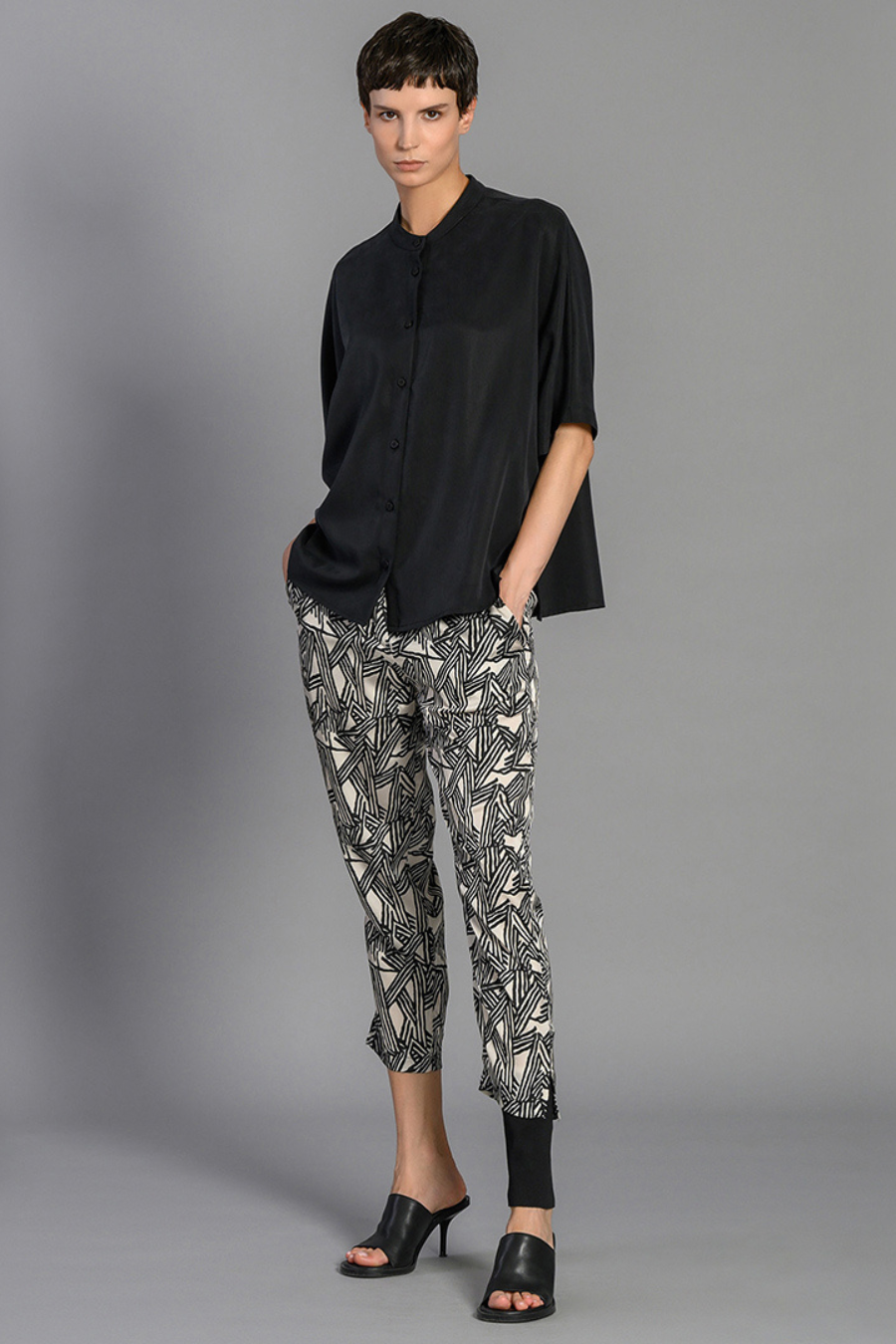The Sonya top has a banded collar and a button-front placket, a drop-shoulder construction, with elbow-length dolman sleeves and a deliberately boxy silhouette. The fit is airy and oversized.