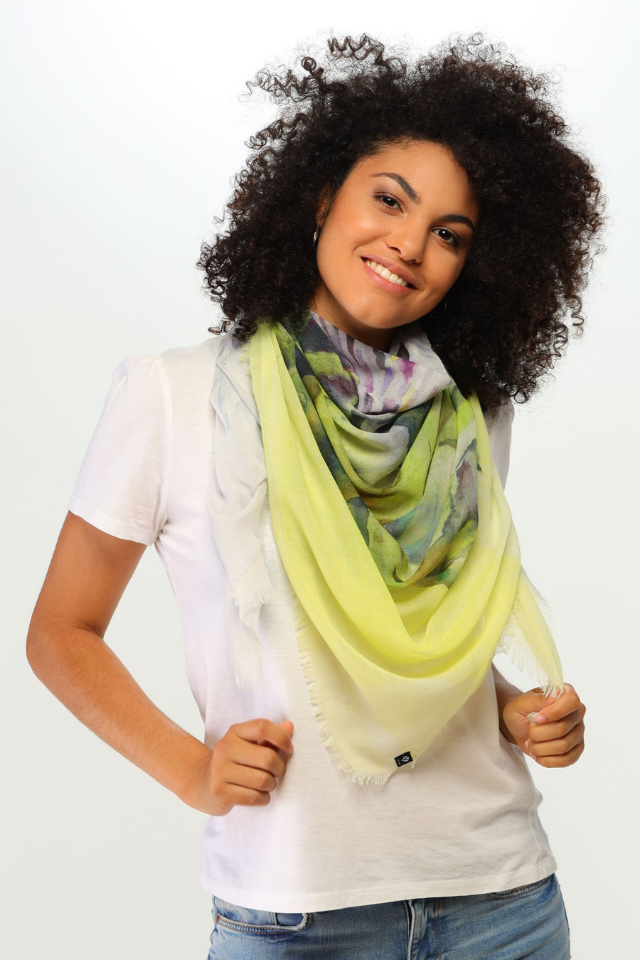 SUSTAINABLE and FASHIONABLE! This elegant watercolour square is one of our HERO styles for Spring/Summer because the fibres woven in this wrap are reclaimed from recycled plastic bottles. Not any fashion floral scarf, this is a true sustainable hero accessory. This lightweight square style can be worn in a variety of ways: wrapped in a casual loop around the neck, draped down loose to show the colours, or as a trendy pashmina shawl for extra warmth over the shoulders. It's a great accessory for a sporty casual look, or a fashionable update for your elegant evening outfit.