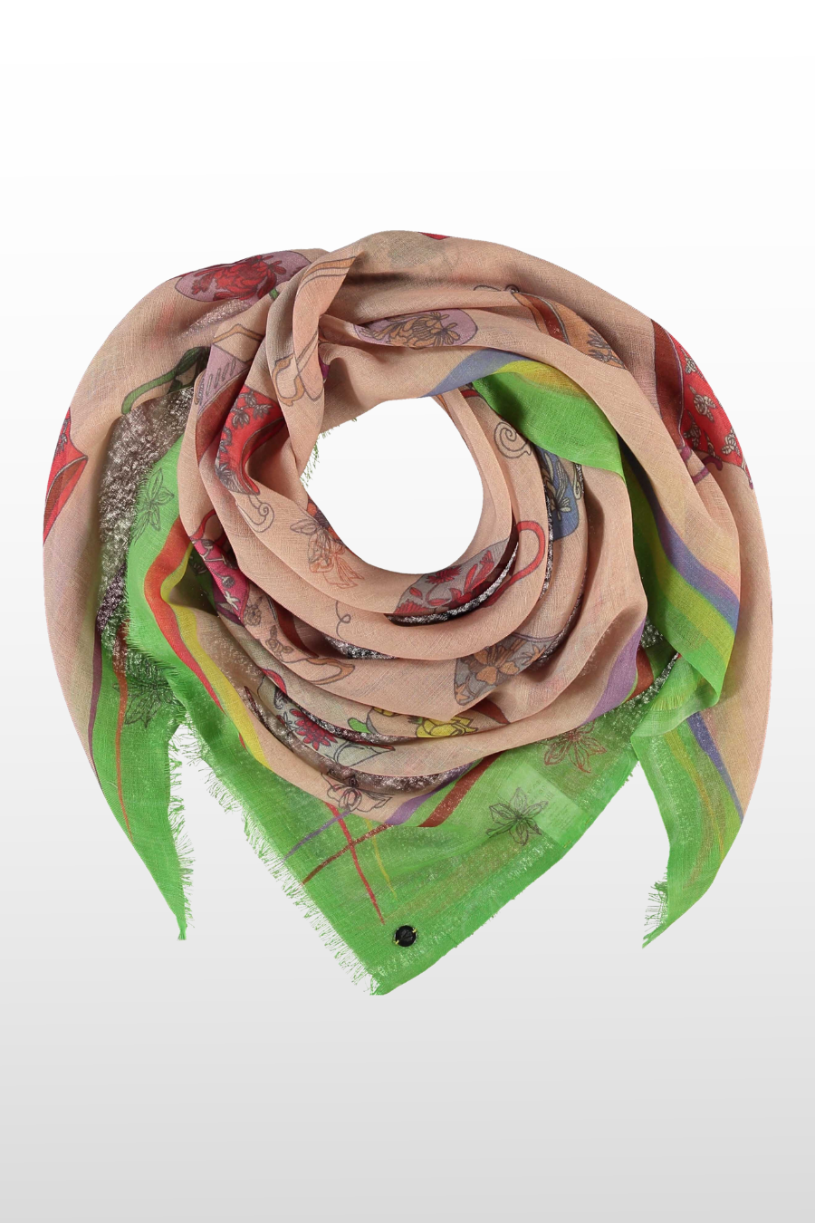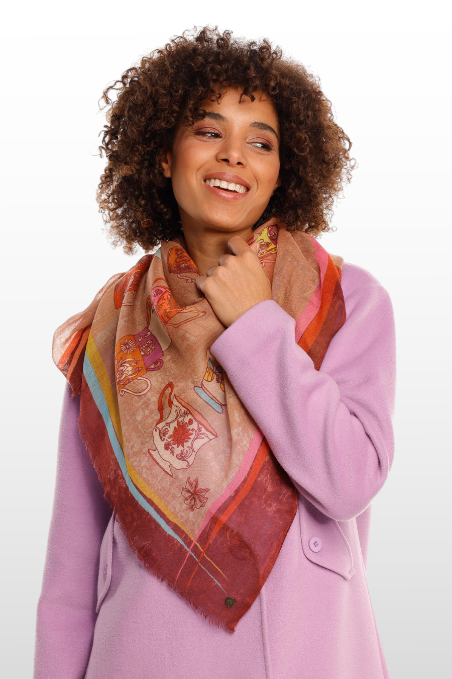 Time for Tea! An elegant conversational print that is perfect for those looking for pure natural fibres. This lightweight wool quality is soft against the skin, but still adds a touch of warmth. Adds a pop of colour and pattern to any casual look, or is a chic update to your business blazer. Try it folded and looped like an oversized bandana scarf, draped over your shoulders as a chic shawl in the evenings, or knotted twice for a cozy infinity-scarf look. No need to worry about size with this gift idea!