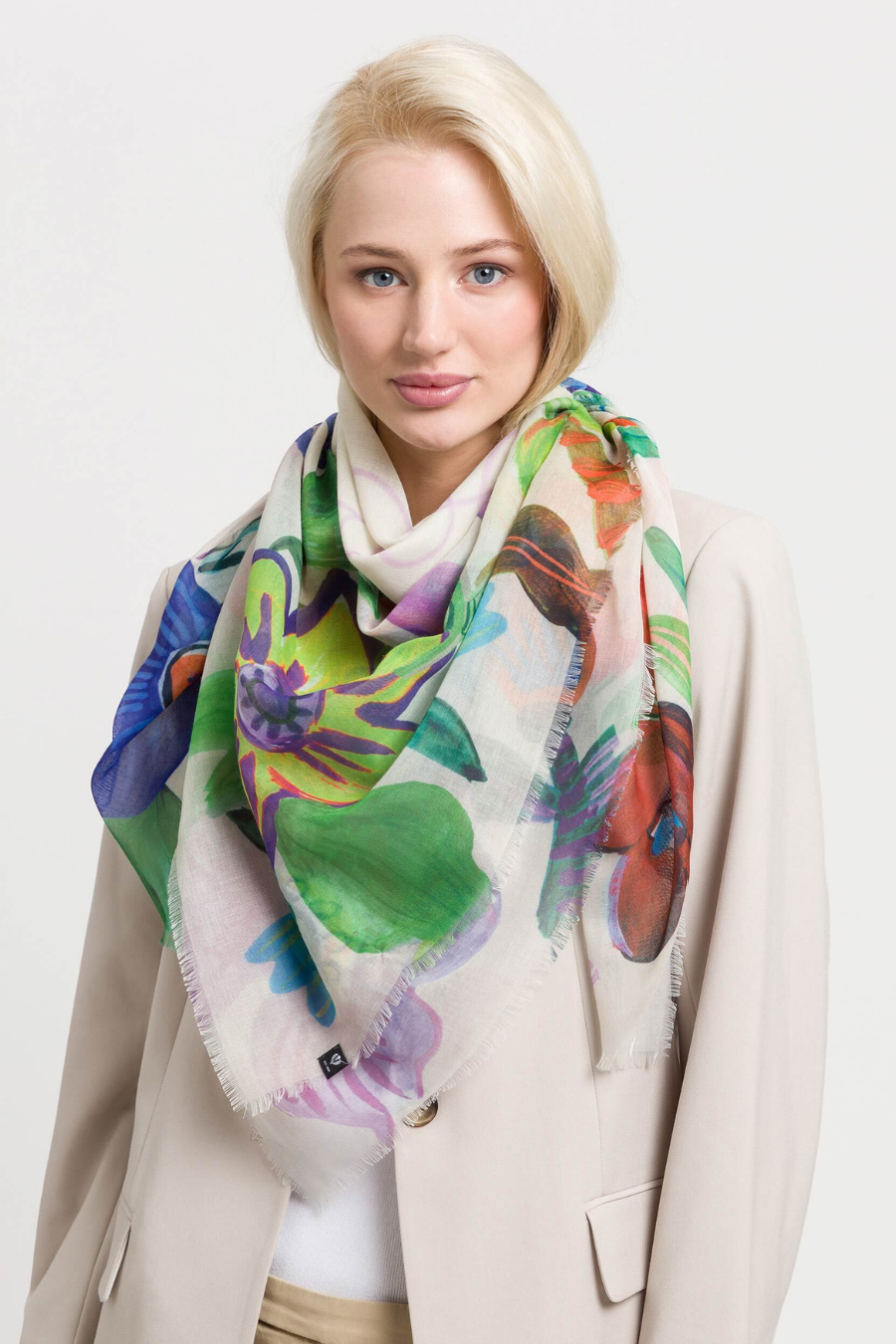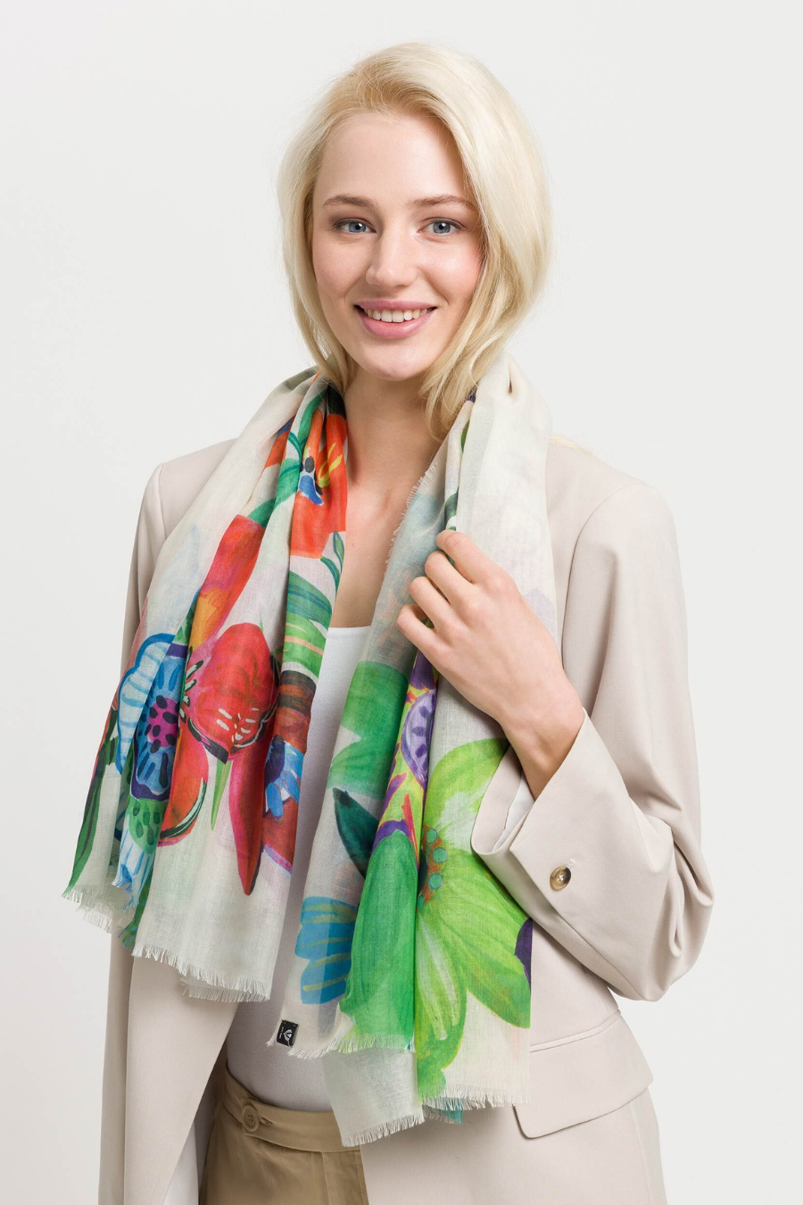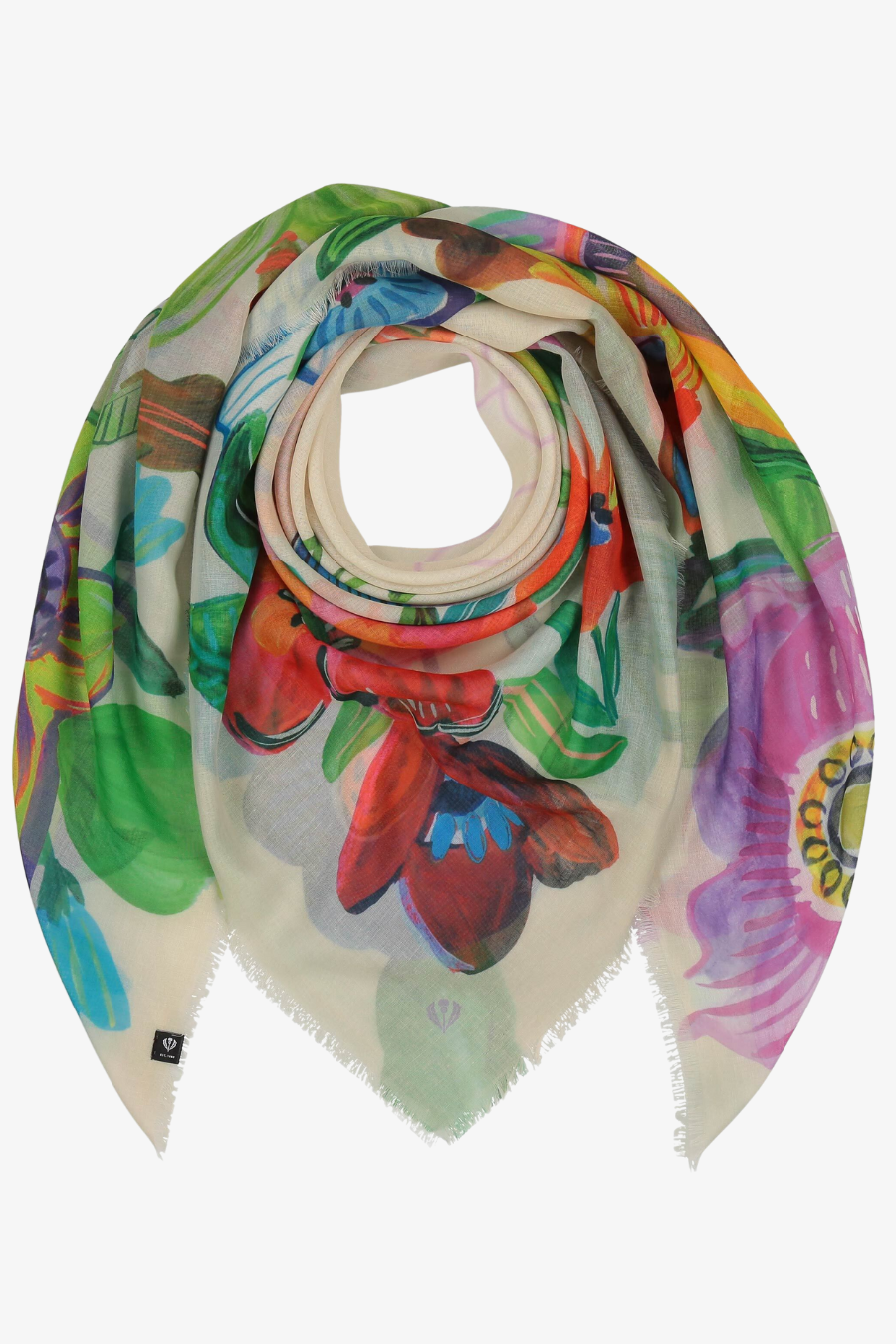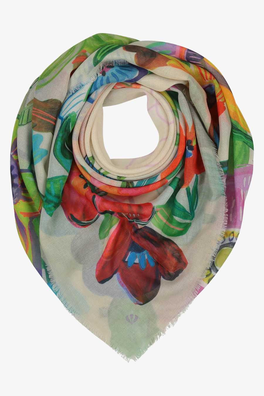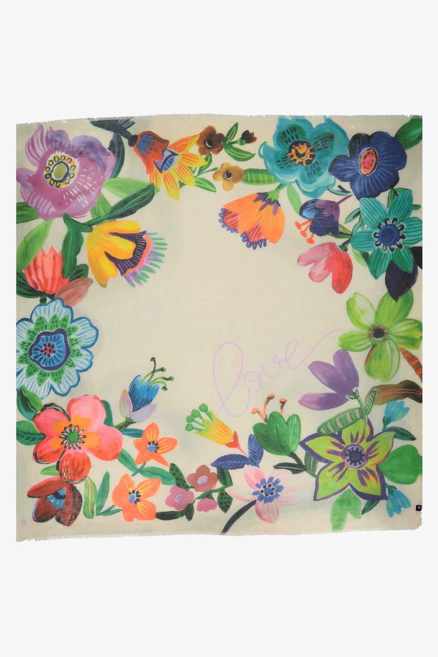 Romantic accessory: the delicate scarf with a colourful floral print and the inscription LOVE enchants every outfit. Measuring 120 x 120 cm, it can be knotted around the neck as a triangle or draped elegantly around the shoulders. Another plus point: the scarf was produced sustainably. It is made from 100% recycled polyester obtained from used PET bottles.