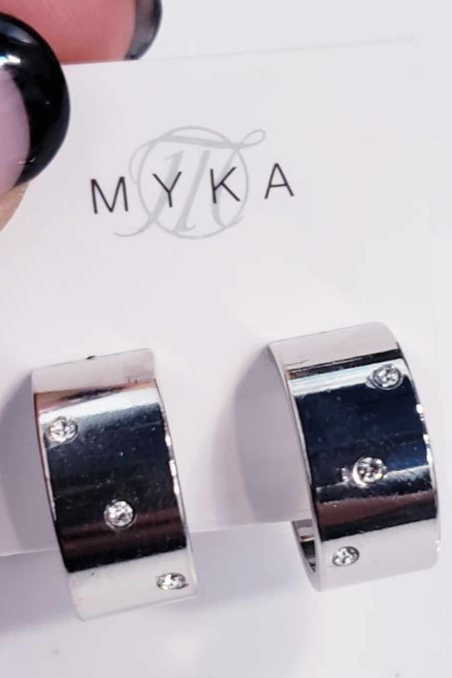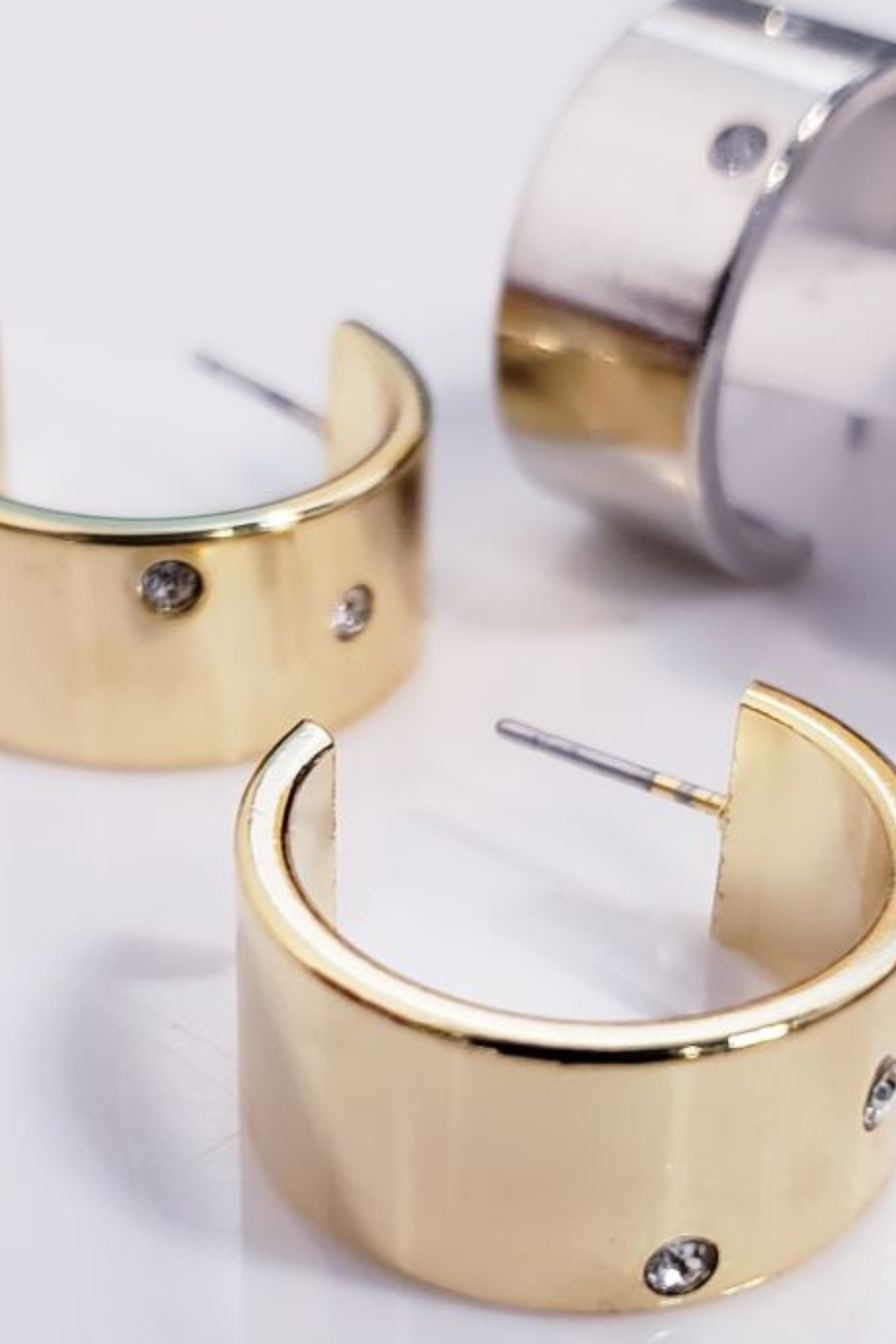 Medium sized wide Flat Hoop Earrings with Crystal Details, Rhodium or Gold plated