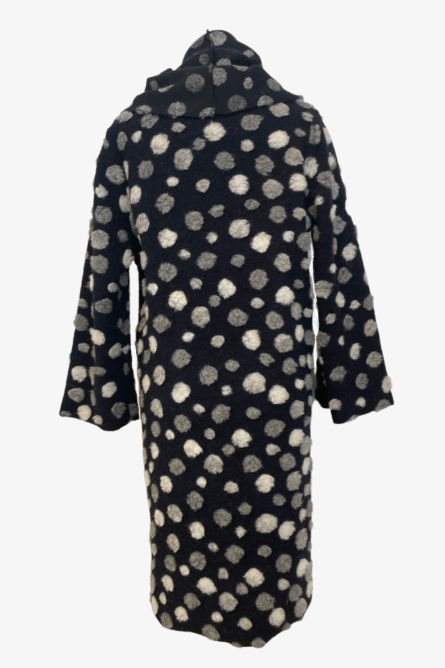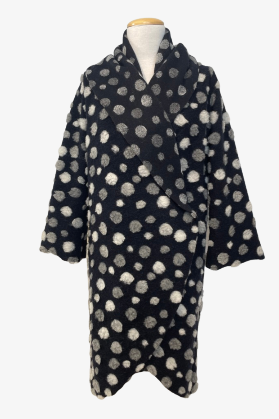 Wrap Coat in Navy Wool with Grey and Cream Dots